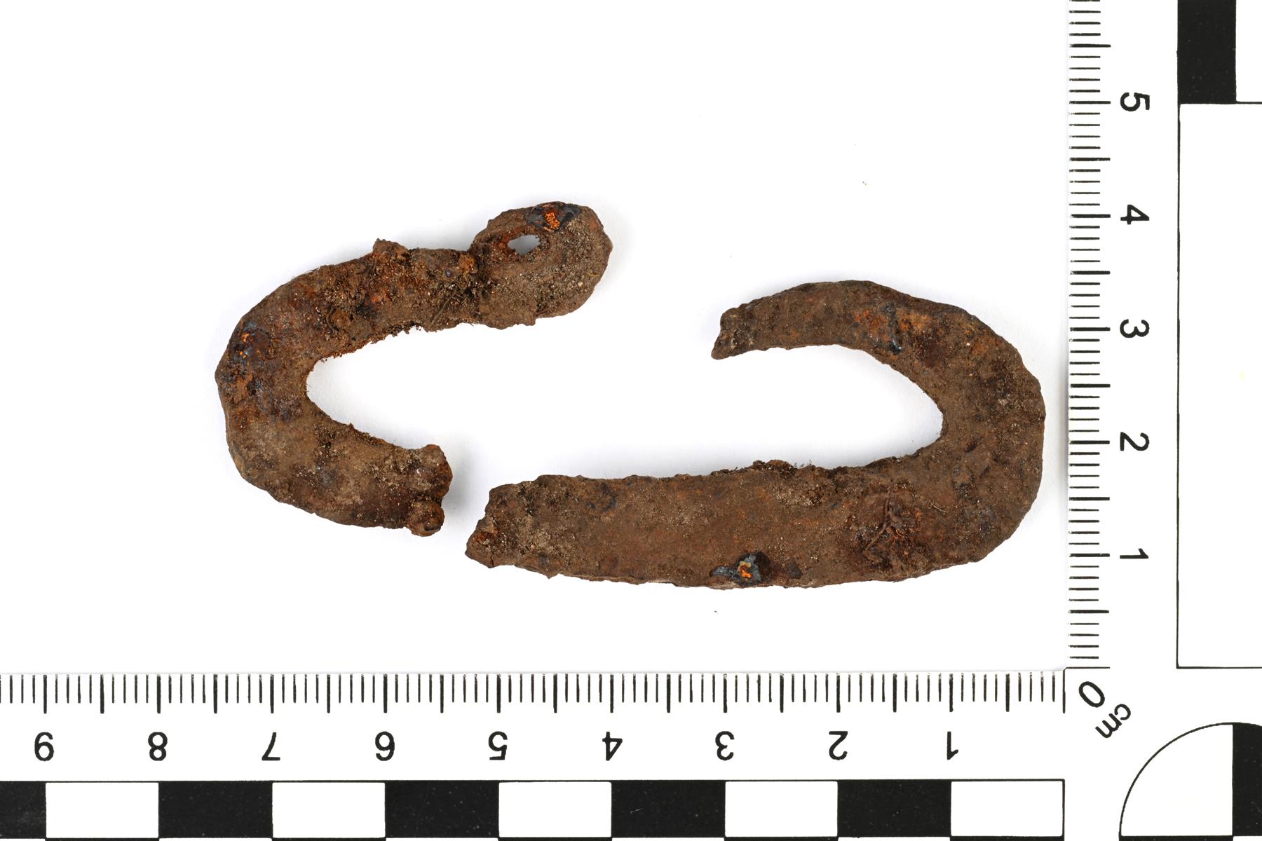 | Kahteen osaan hajonnut lyyranmuotoinen tulusrauta. | |