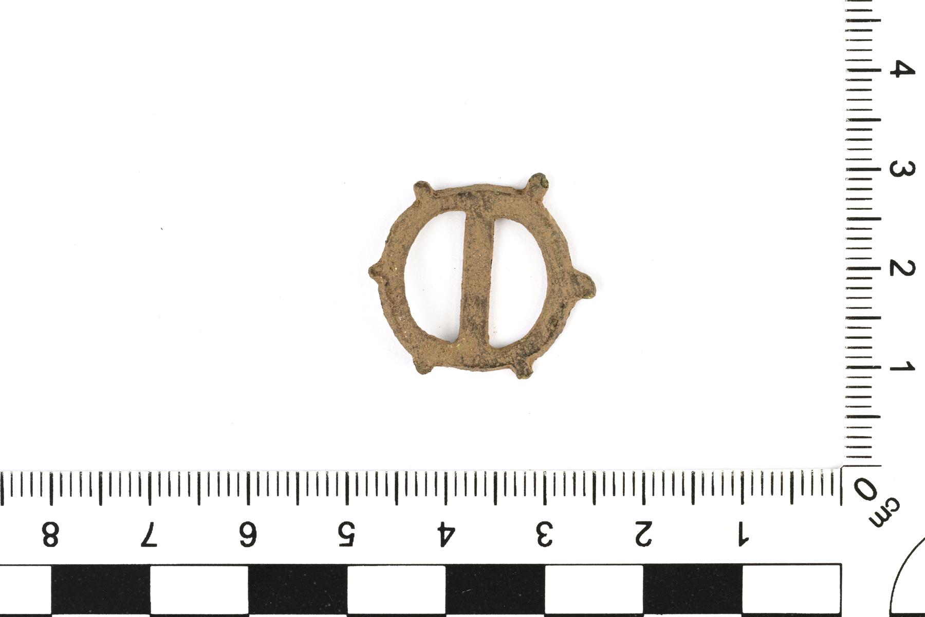 | Ovaali hihnansolki. Neula puuttuu. Keskellä on poikittainen varsi. Kehän ulkoreunalla on kuusi piikkimäistä ulkonemaa. | |