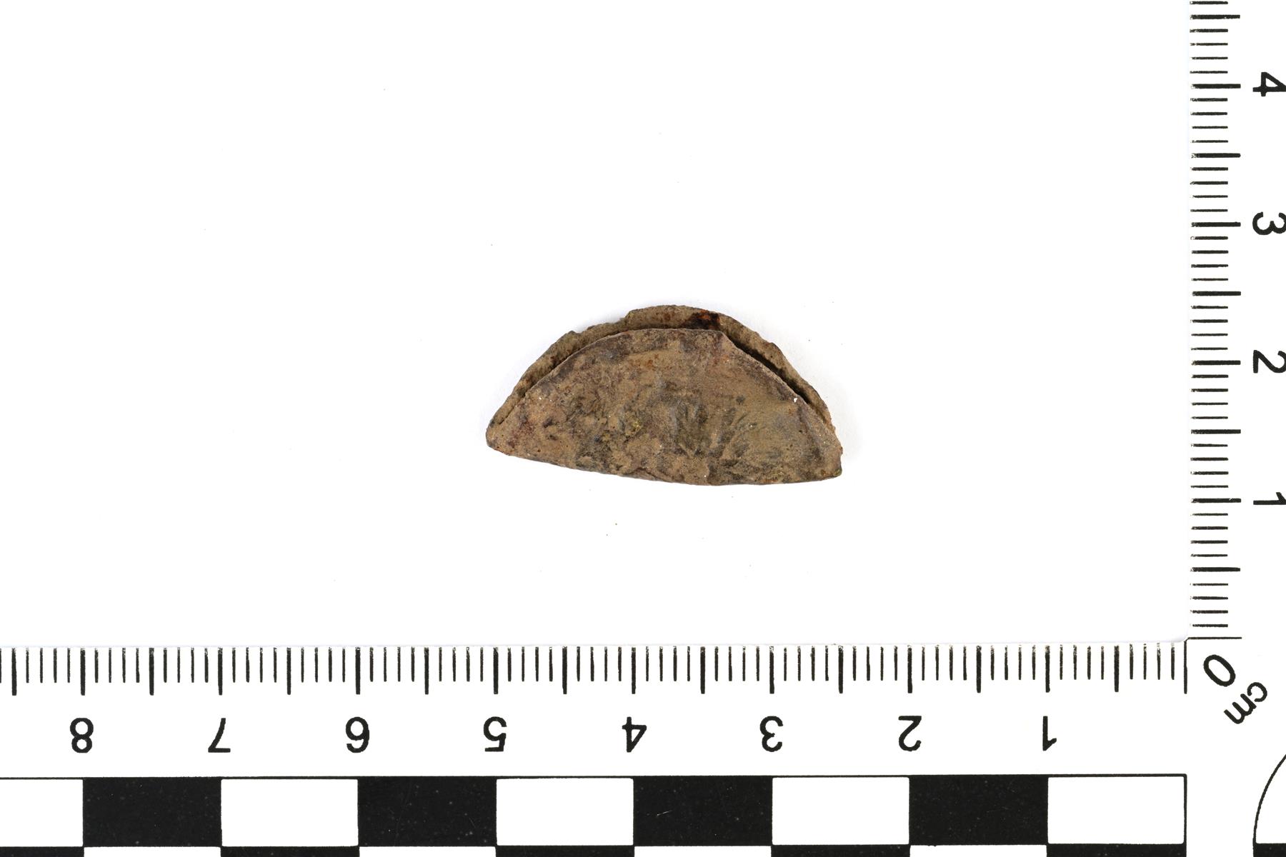 | Taitettu kupariseoslevy. Todennäköisesti kiekkonappi tai erittäin kulunut raha. | |