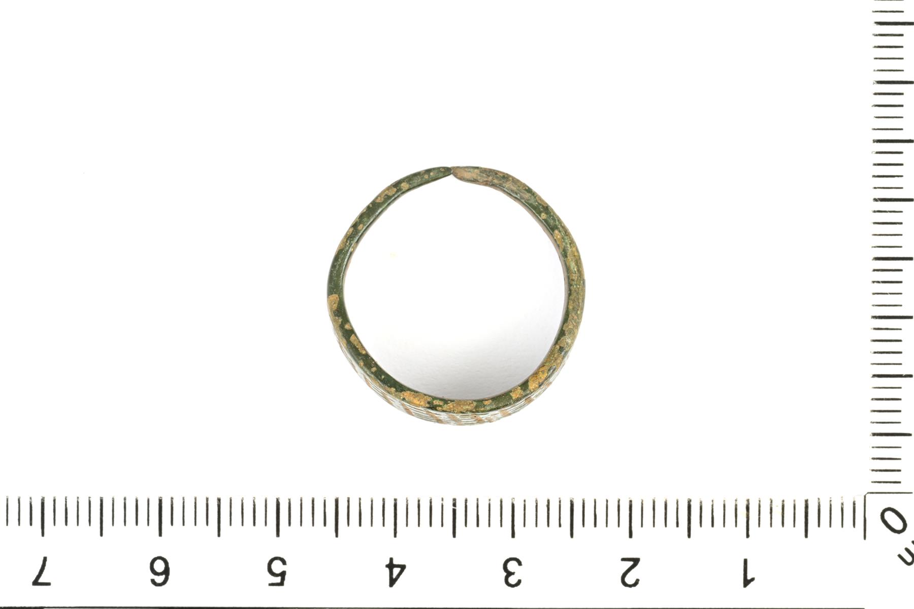 | Kokonaisena säilynyt avosormus. Keskiosa levenee kilpimäiseksi. Koristeluna ristikkokuviointia, joka on tehty hammastetulla neliöviivapunsselilla. | |