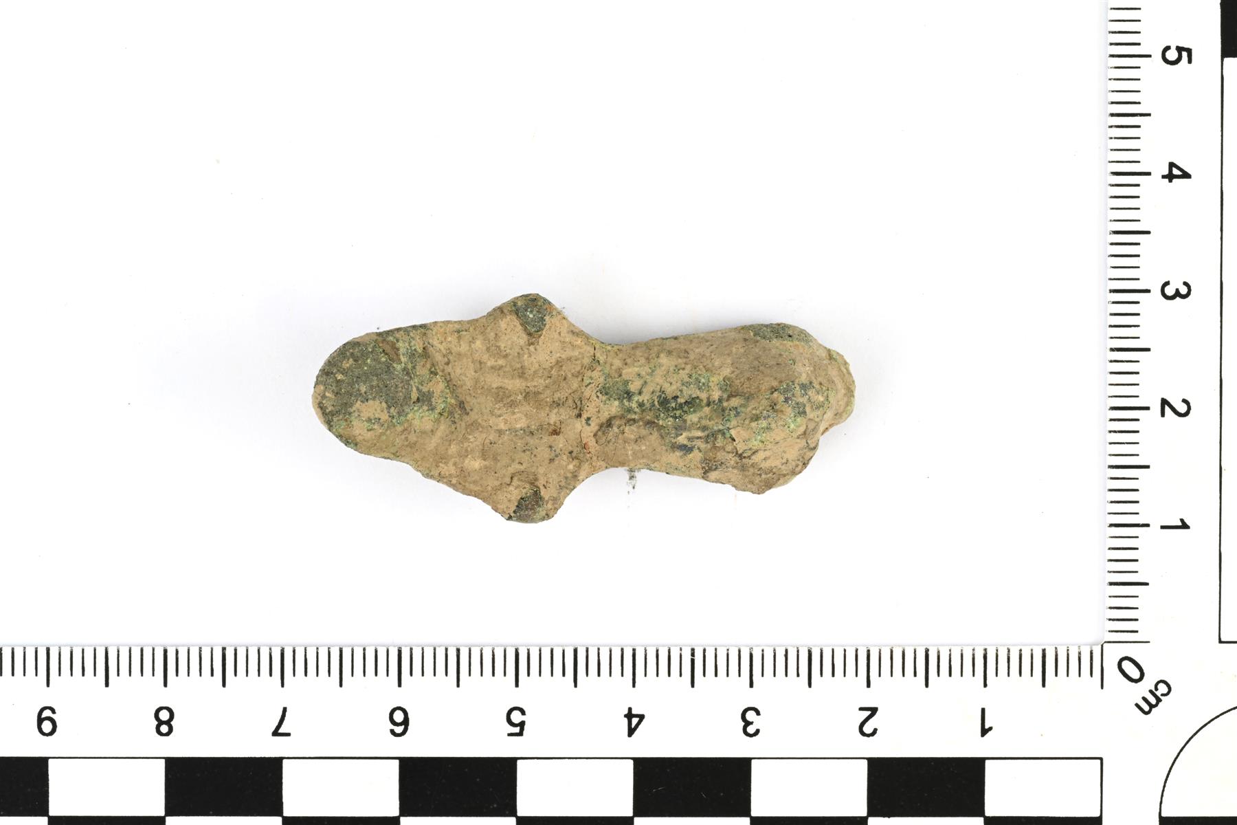 | Tasavartisen soljen keskiosan ja päädyn katkelma. Koristeluna viivauurteita ja päädyssä ovaali paksunnos. Taustapuolella on säilyneenä kaksi jousilaitteen kiinnityslenkkiä. Keskiosa on taustapuolella hieman koverrettu. Kuuluu ryhmän 8 solkiin. Vrt. Kivikoski Fig. 21. | |