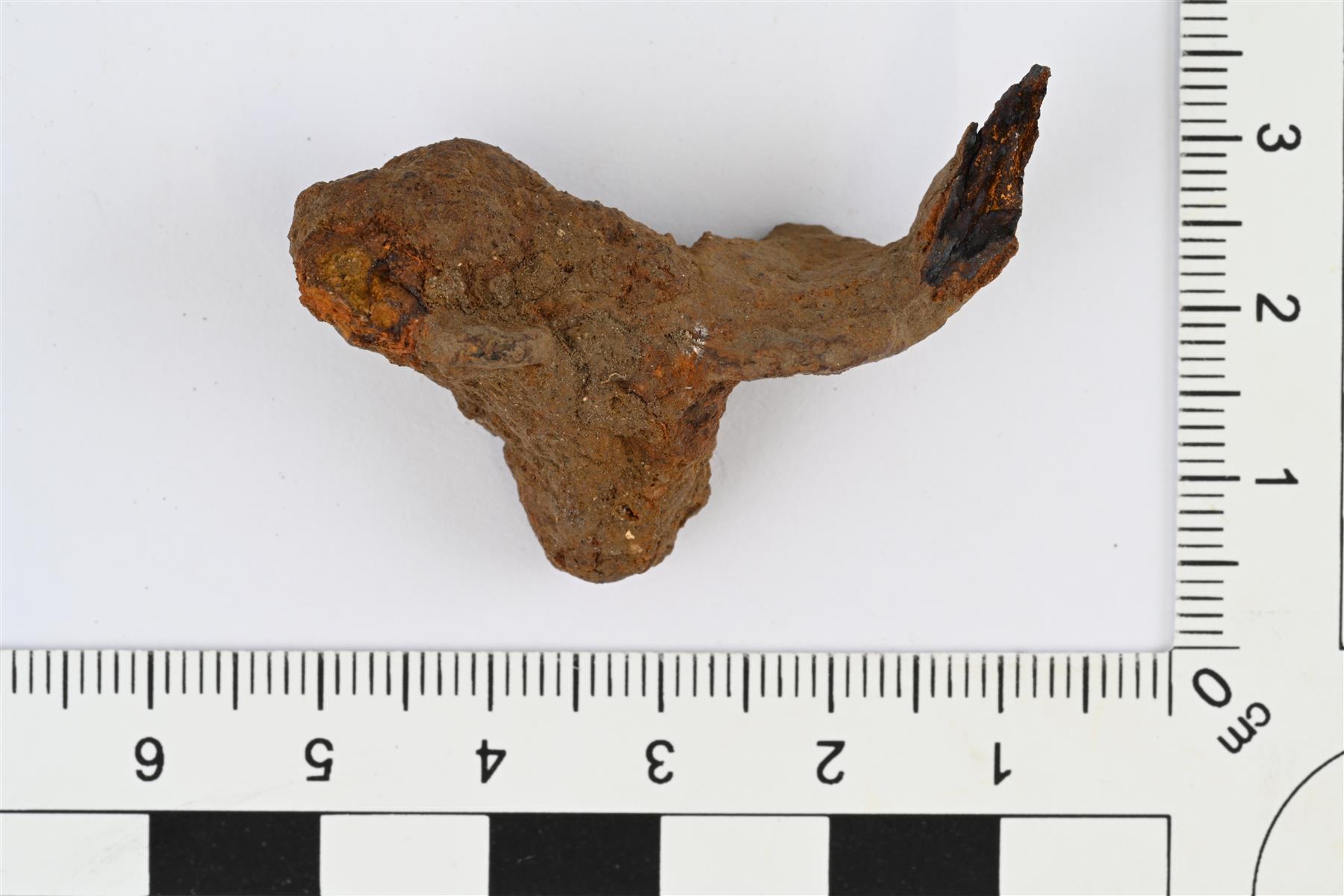 | Kaksipiikkinen hevosen viskari. Kahdeksikon muotoinen levy, jonka keskellä toisella puolella kohoava ja suippeneva jäänasta. Levyn toisella puolella sen päissä ohuet sisäänpäin taivutetut varret, joista toinen katkennut juuresta. Vrt. Kivikoski 1973, Taf. 110, Abb. 996. | |