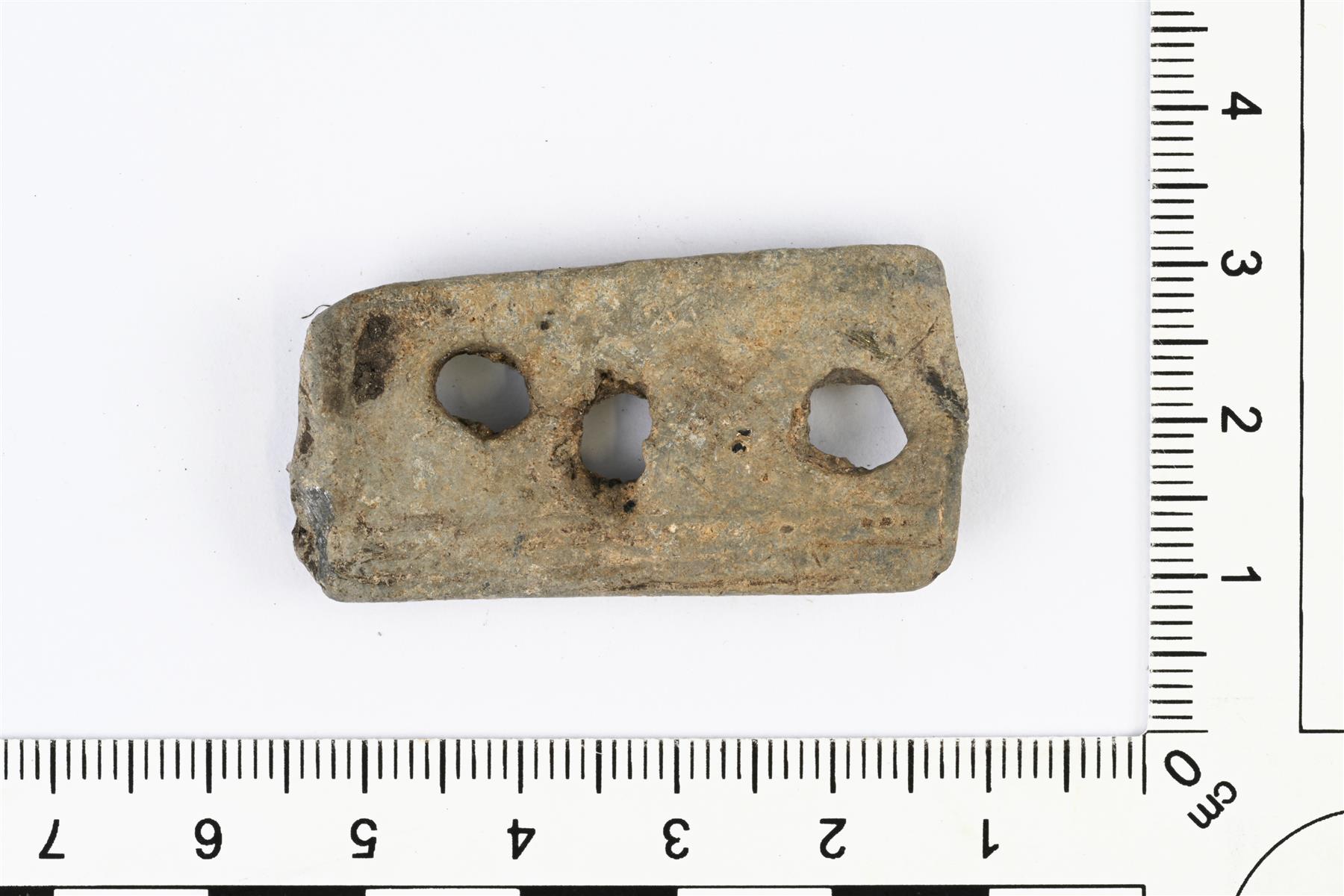 | Lyijylevyn katkelma. Yhdessä reunassa poikittaisia viivauurteita. Keskellä kolme lävistettyä reikää. | |