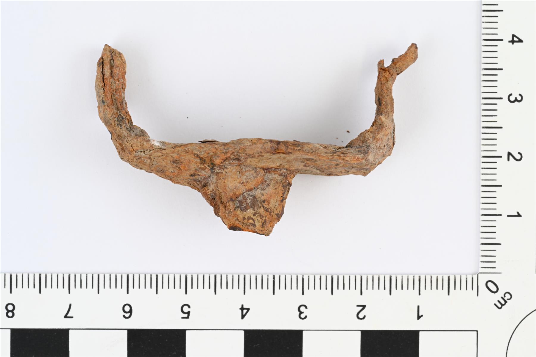 | Kaksipiikkinen hevosen viskari. Soikeahko levy, jonka keskellä toisella puolella kohoava ja suippeneva jäänasta. Levyn toisella puolella sen päissä ohuet sisäänpäin taivutetut varret. Vrt. Kivikoski 1973, Taf. 110, Abb. 996. | |