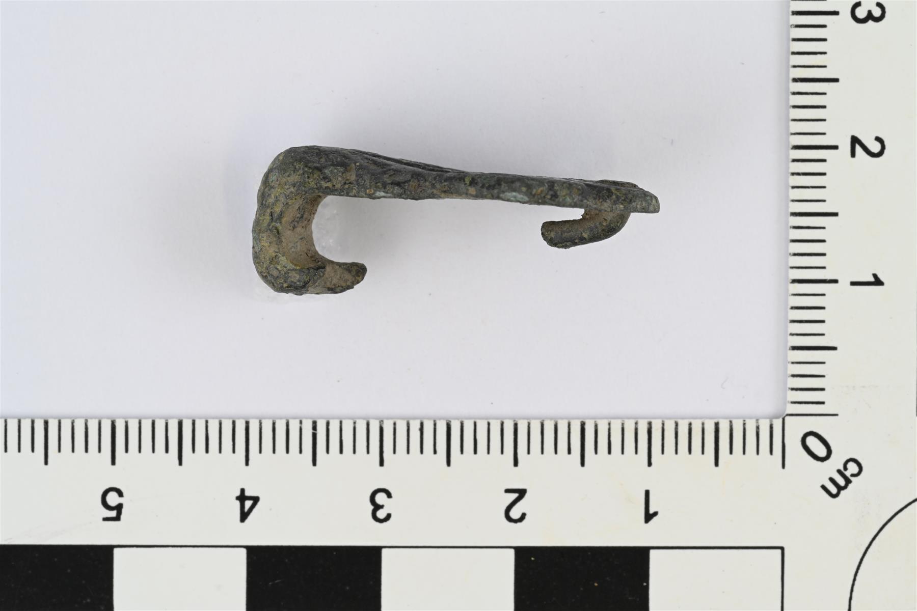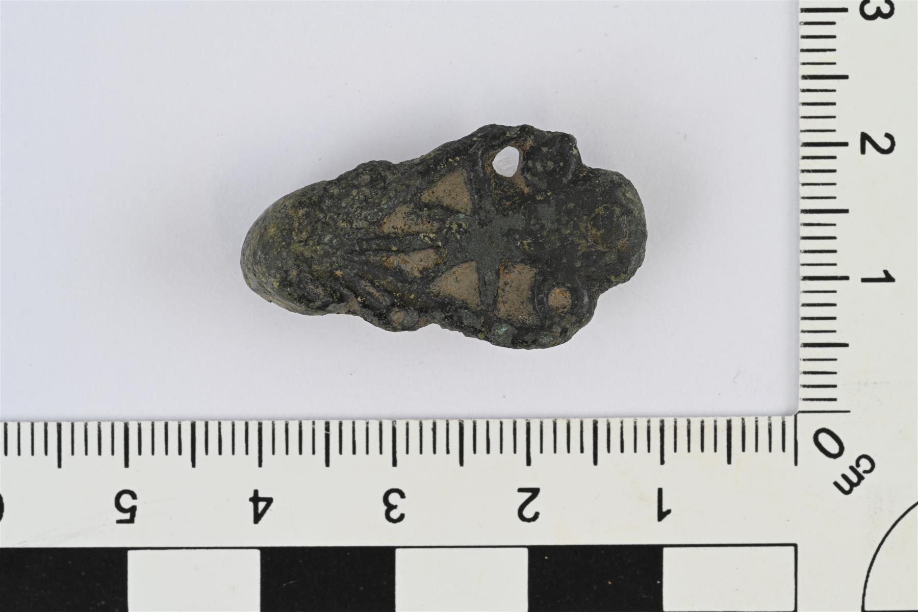 | Katkelmallinen hihnanjakajan hela. Koristeltu etupuoli ehjä, taustapuolen kapeampi koristelematon varsi katkennut. Muodoltaan muistuttaa eläinpäistä helaa, koristelu kuitenkin lähinnä palmettiaiheinen. Etupuolen kärjessä jäljellä niitti. | |
