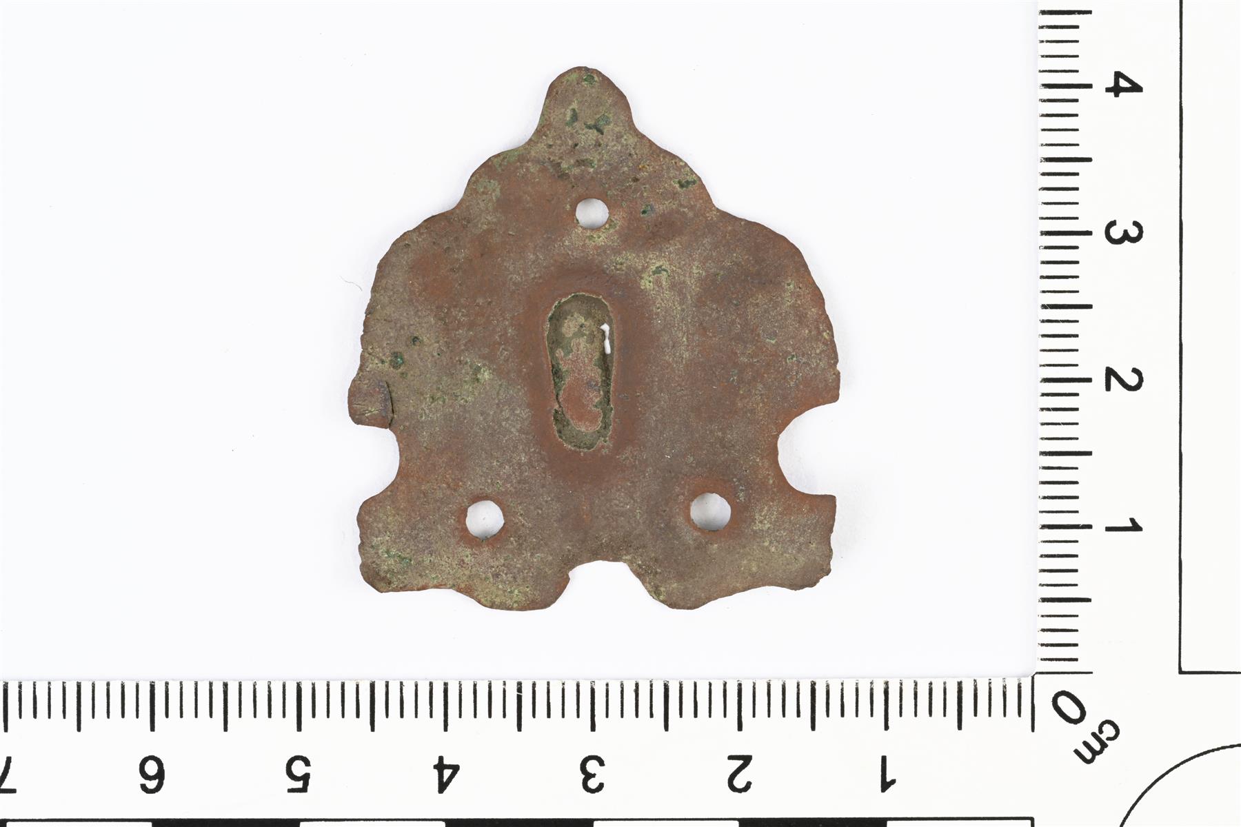 | Todennäköisesti huonekalun tai vastaavan hela. Kolme reikää kiinnitystä varten. | |