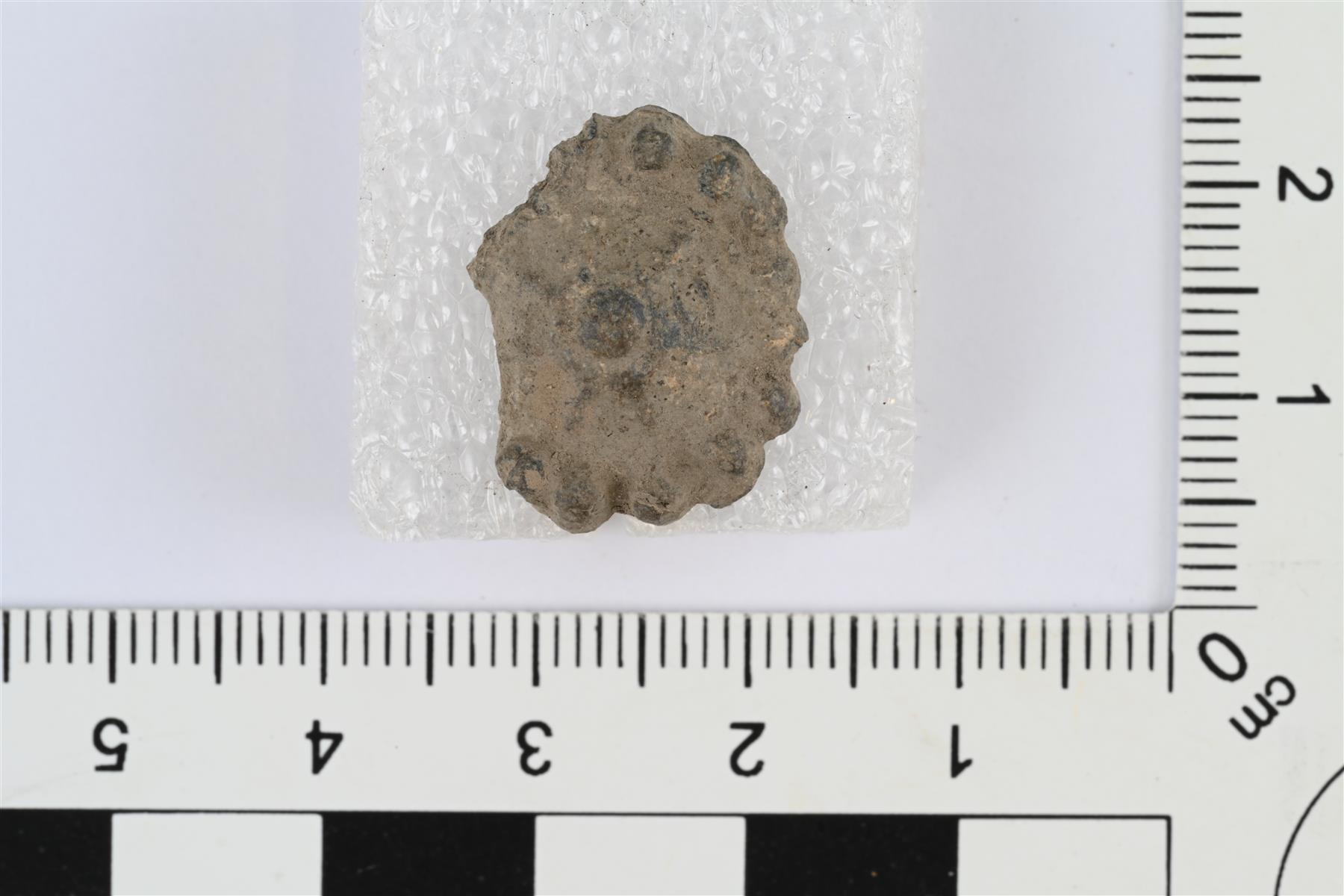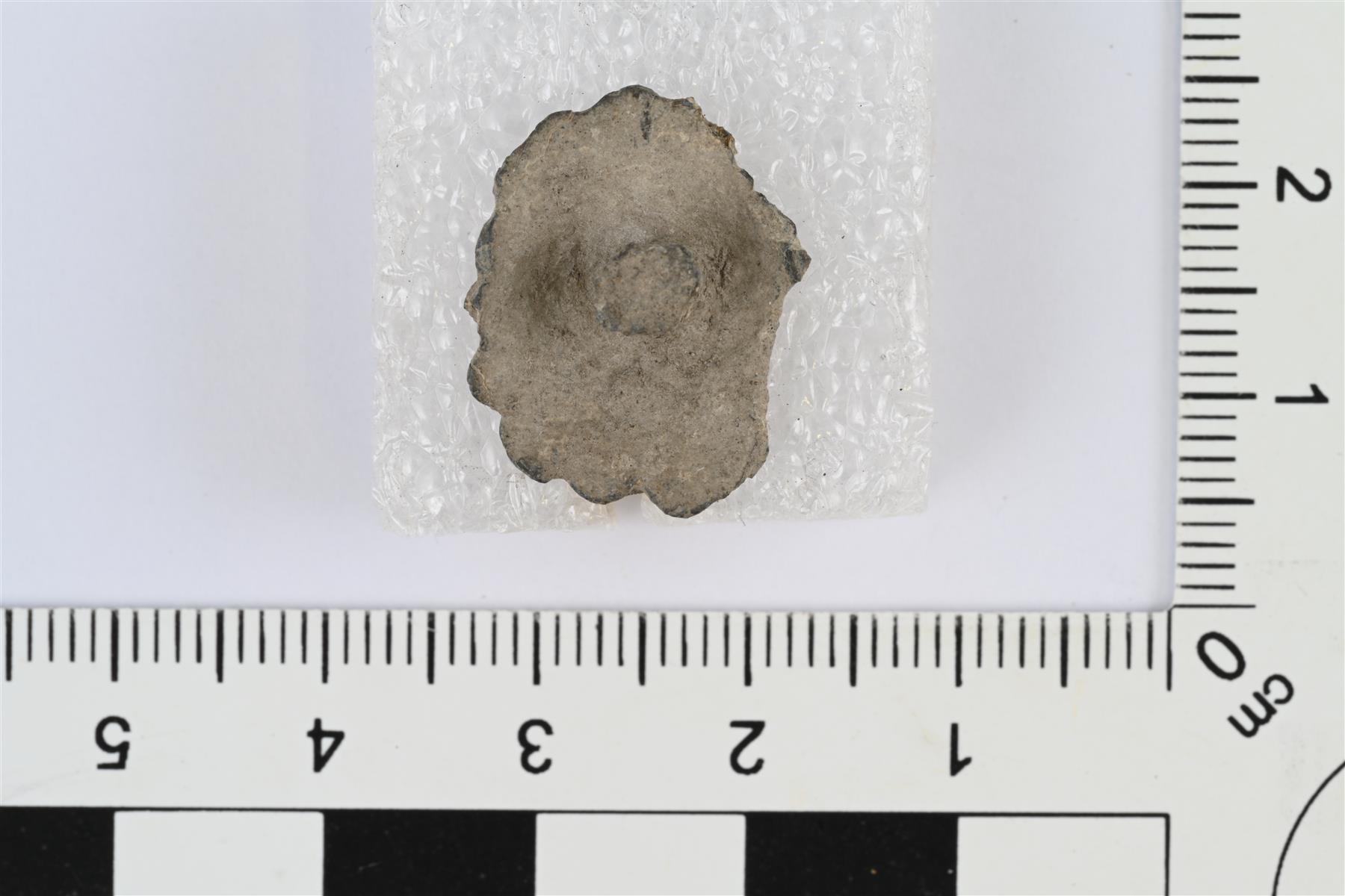 | Vyön- tai hihnanhela. Soikea, etupuoli kupera. Etupuolella reliefikoristeluna säteittäinen kuvio ja reunaa kiertävä helminauhareunus. Taustapuolella kiinnitystappi. Reunasta murtunut paloja. Lähes samanlainen kuin hela KM 46589:4, helat löytyivät alle 2 m päästä toisistaan. | |