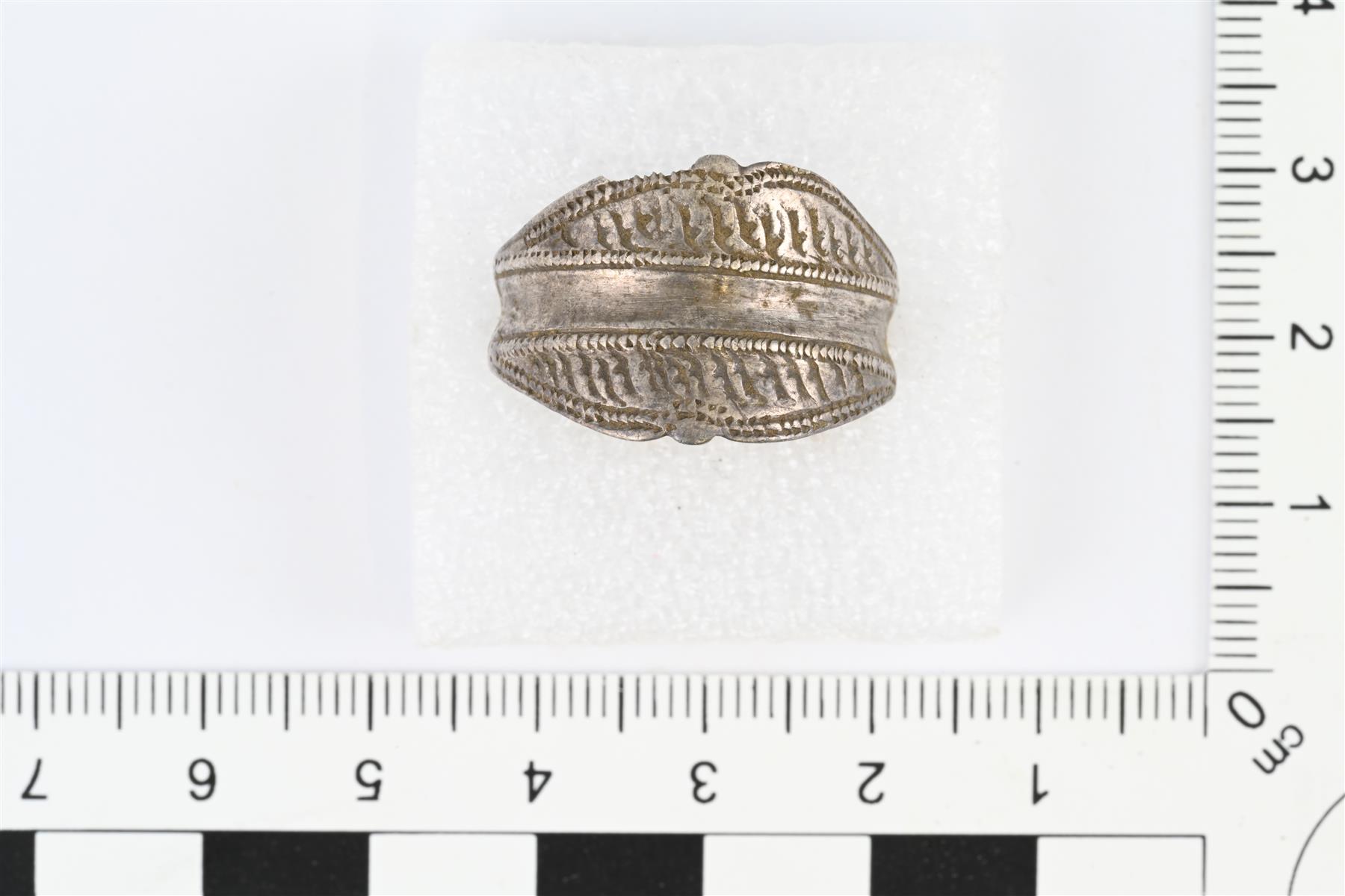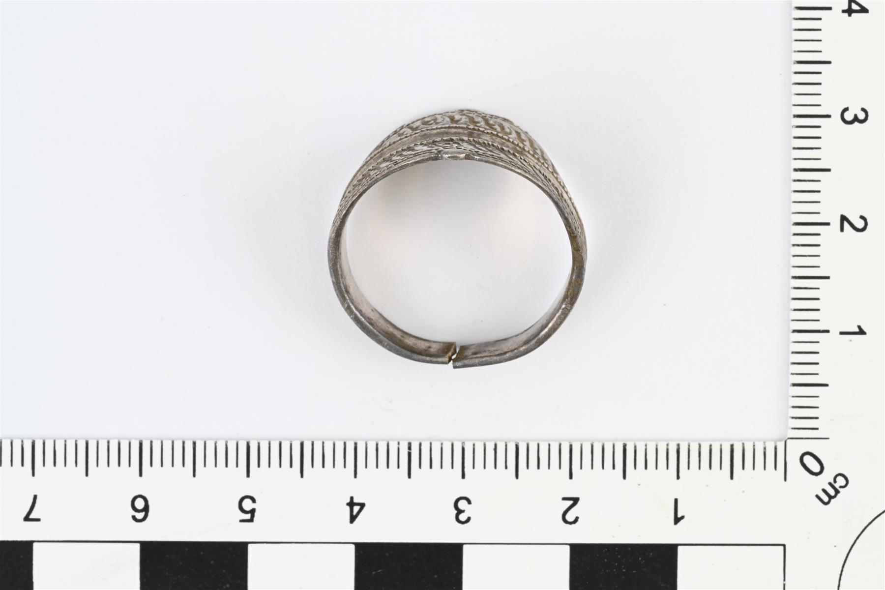 | Talonpoikainen saraperäsormus. Etupuoli muuta kehää leveämpi, reunat koristeellisesti muotoillut. Keskellä kulkee poikittainen leveä uurre. Uurteen reunoissa sekä sormuksen ylä- ja alareunassa pienten kolmioiden muodostamat koristeraidat. Uurteen ylä- ja alapuolella koristelua. kehä katkennut. | |
