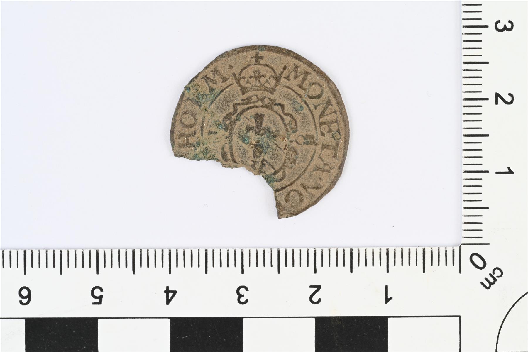 | Juhana III, 2 äyriä, Tukholma 1573. Reunasta murtunut pala. | |