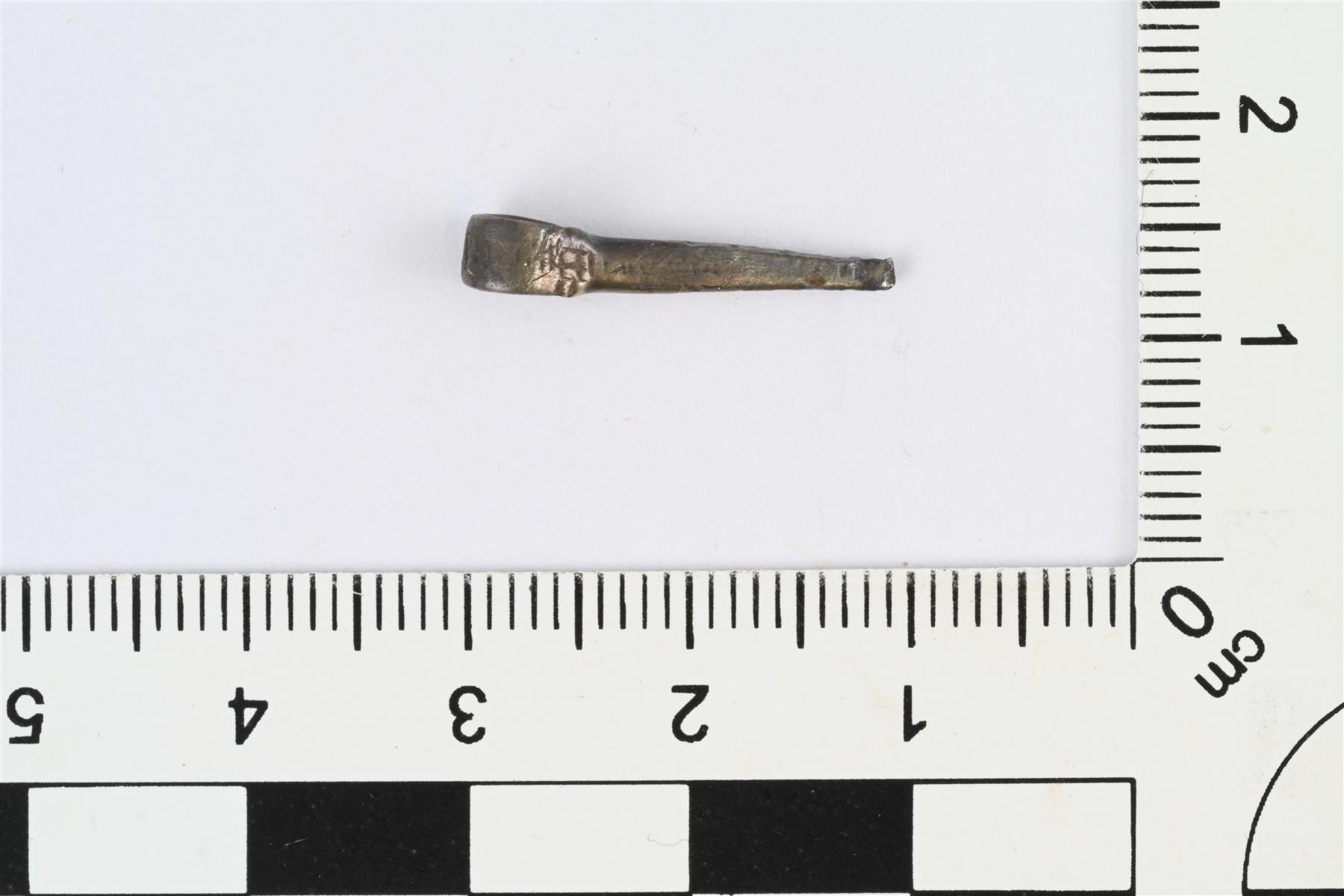 | Pieni soljen neula. Litteähkö, kanta levenevä ja kierretty lenkiksi. Lenkin etupuolella leima, jossa neliön sisällä risti. Neulan sivuissa muotoilujälkiä. | |