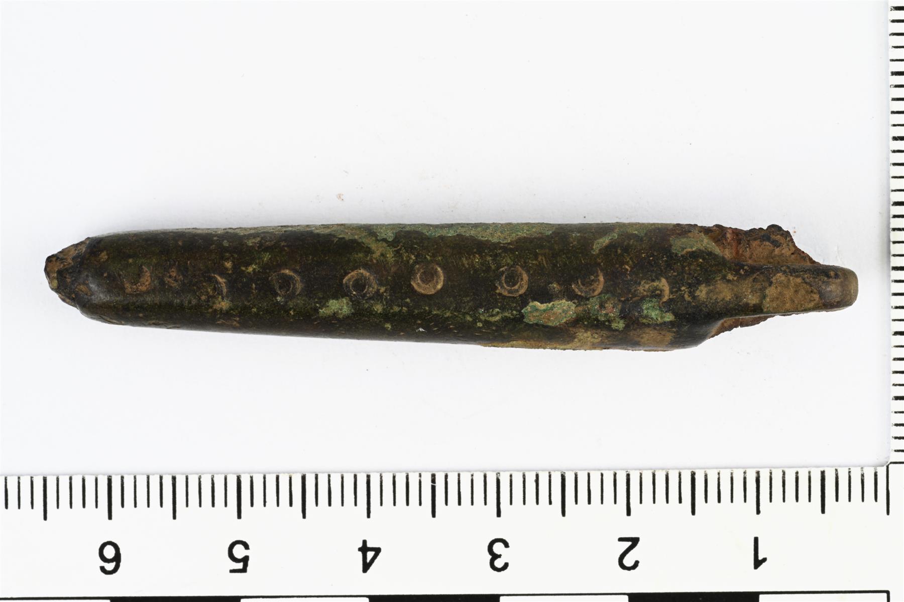 | Puikkomainen kupariseosesine. Leveämmässä päässä on kapea levy, jossa on reikä. Kumpaankin päähän on tarttunut raudan paloja. Sivuilla on koristeena häränsilmäleimoja. Mahdollisesti vaakaan kuuluneen varren katkelma. | |