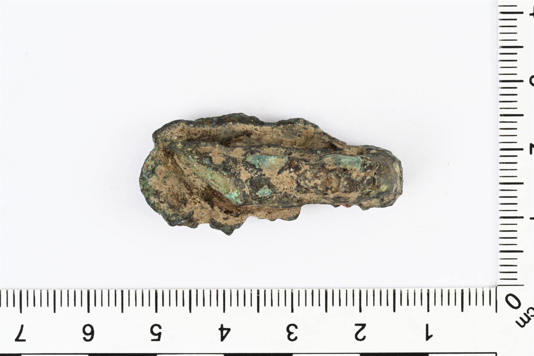 | Eläinpäinen hihnanjakajan hela. Etupuolella on koristeluna tyylitelty eläimen pää. Taustapuolella oleva kapea kiinnitysvarsi on katkennut läheltä kärkeä. Vrt. Kivikoski Abb. 893 ja 1203. | |