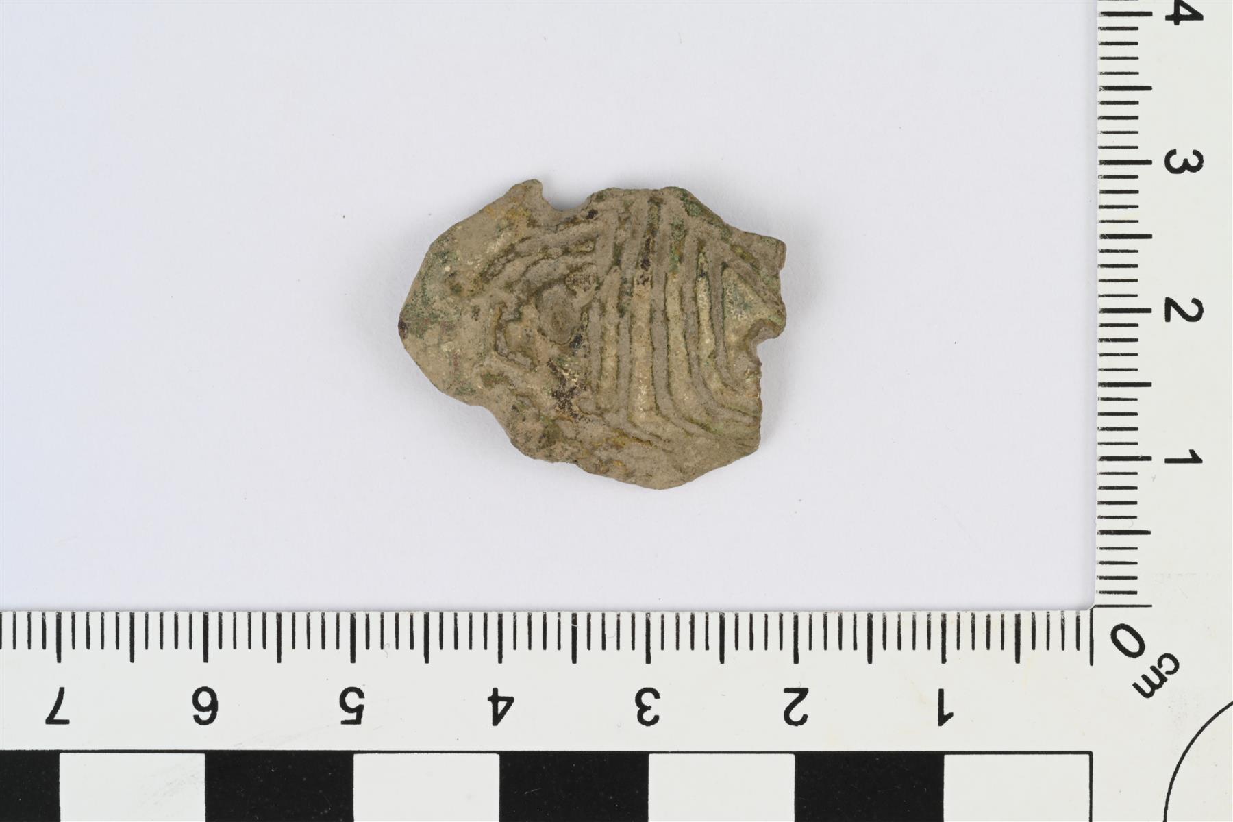 | Pyöreän kupurasoljen katkelma. Vastaa Appelgrenin D-tyyppiä. Katkelmassa ei reunaa tai tappeja mukana. Etupuolella viivakoristelua, katkelmassa myös useita pieniä pyöreitä reikiä. | |