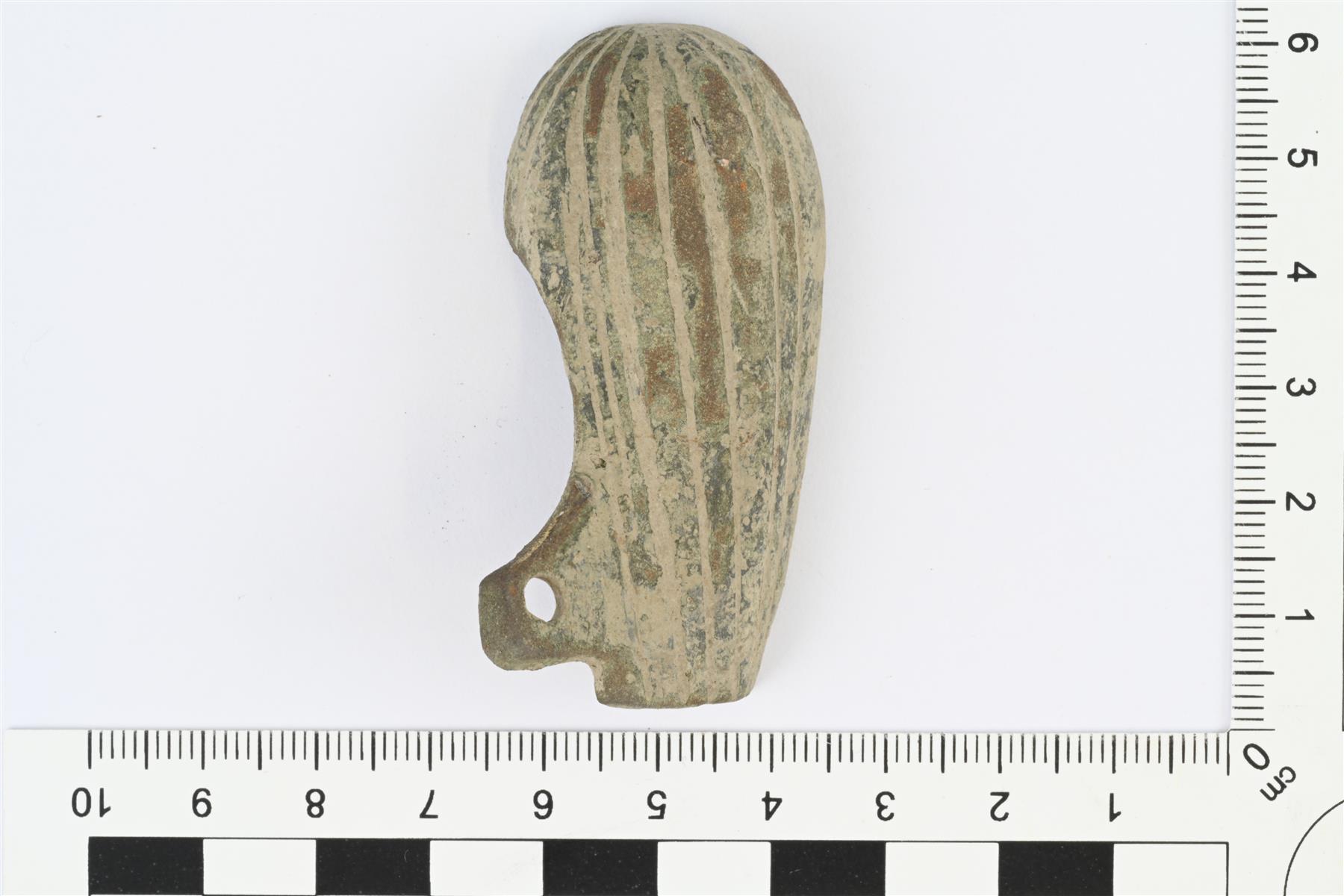 | Satulan metallinupin puolikas. Puolikas sylinteristä, jonka toinen pää umpinainen ja pyöristetty. Toisessa sivussa pieni uloke, jossa pyöreä reikä. Koristeluna umpinaisesta päästä säteittäisesti lähteviä viivauurteita. | |