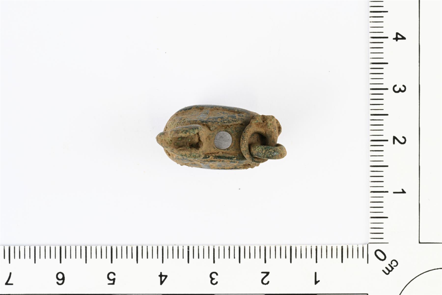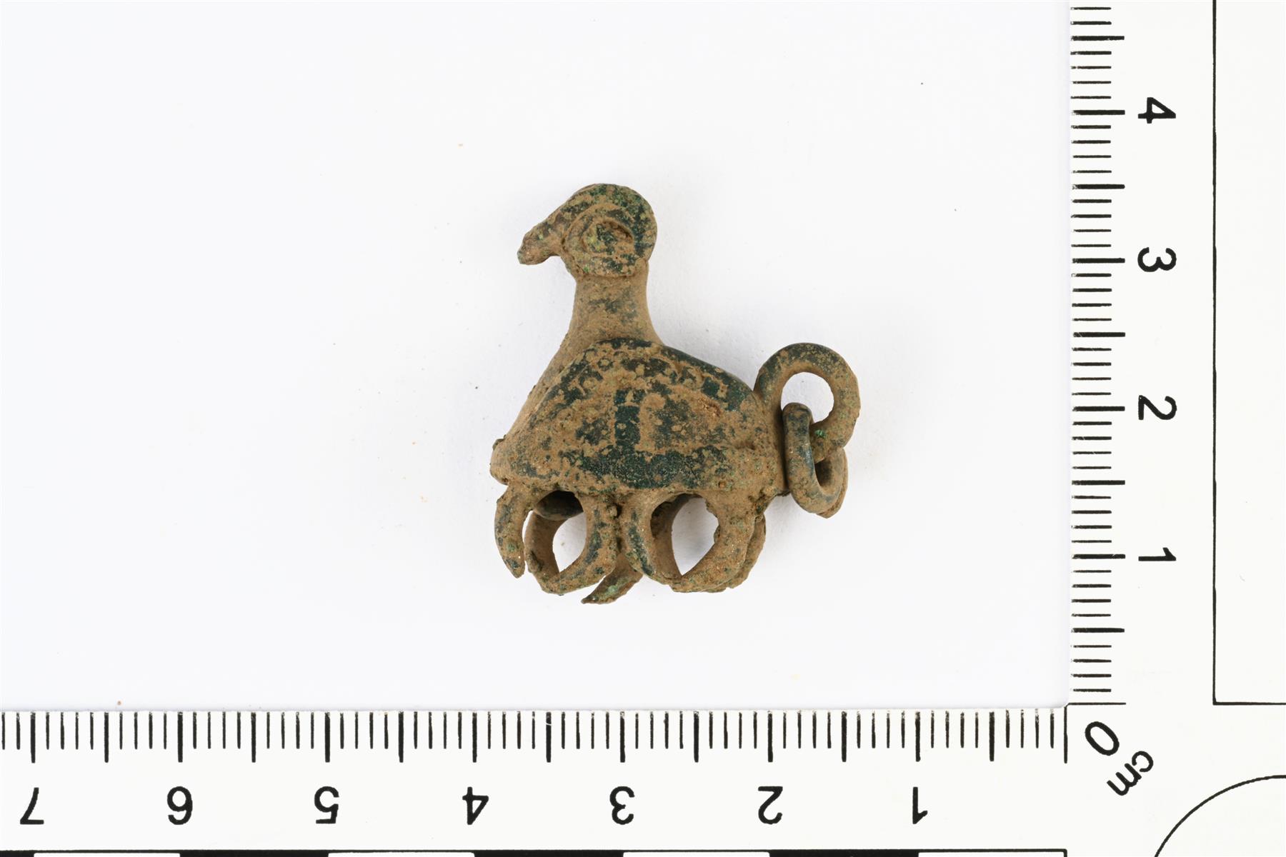 | Plastinen linturiipus. Pään kummallakin puolella on spiraalimaisesti kiertyvät kuviot. Pyrstössä on ripustuslenkki, jossa on säilyneenä pieni rengas. Alareunassa on neljä lenkkiä, joista etummaiset ovat hajonneet alareunasta. Takana olevat ovat melkein kuluneet puhki. Alapuolelta koverrettu ontoksi ja selkäpuolella on pyöreä reikä. Vrt. Kivikoski Abb. 1135. | |