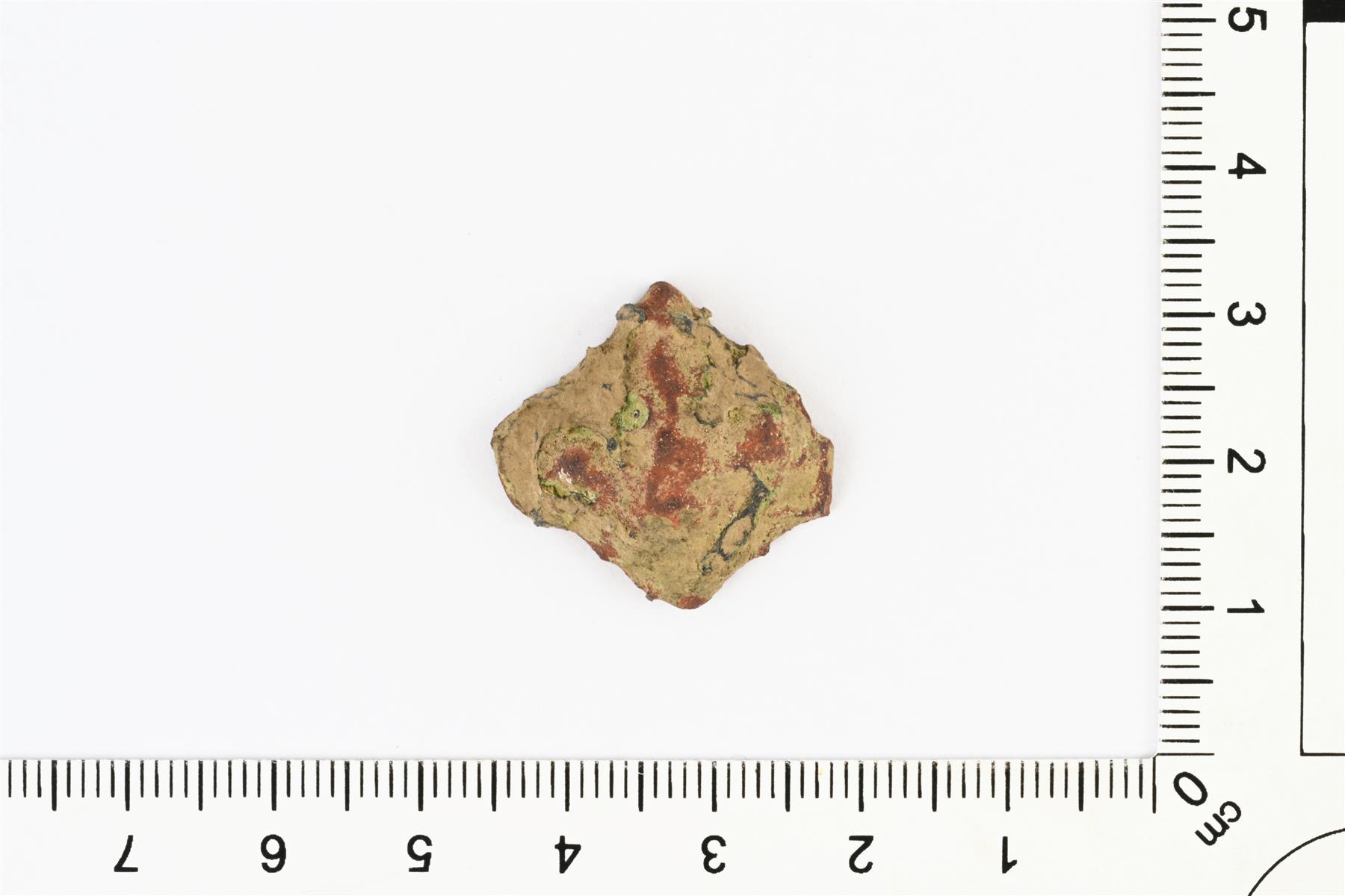 | Tasavartisen soljen keskiosan katkelma. Pinta on hyvin kulunut ja taustapuoli on koverrettu. Tappikoristeista erottaa pieniä jäänteitä. | |