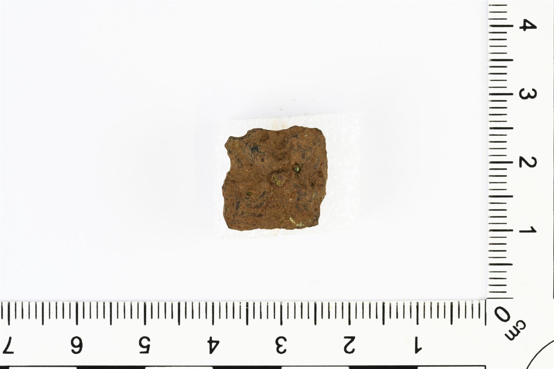 | Neliönmuotoinen ruusukehela. Koristeluna on kohokuviona toteutettu vinoristi. Keskellä reikä, jossa on säilyneenä ohut niitti. Taustapuolella on myös niitin aluslevy, joka on neliönmuotoinen kupariseoslevy. Vrt. Kivikoski Abb. 918 ja 1202. | |