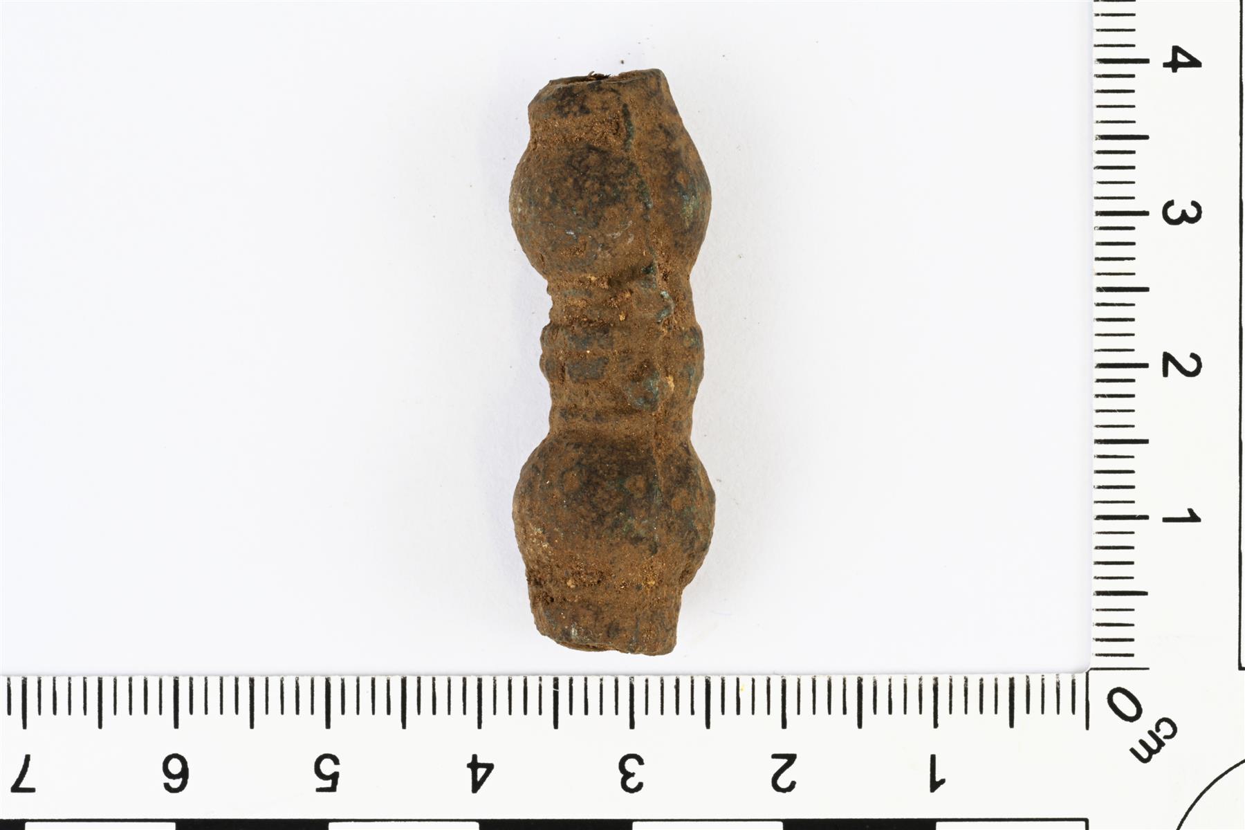| Kaksikorvakkeinen korvakeputki. Sivuilla olevat korvakkeet ovat hajonneet. Päädyt levenevät pallomaiseksi ja keskellä olevassa kapeammassa kohdassa on viivauurteita. Sivuilla on selkeä valusauma. Vrt. Kivikoski Abb. 1160. | |