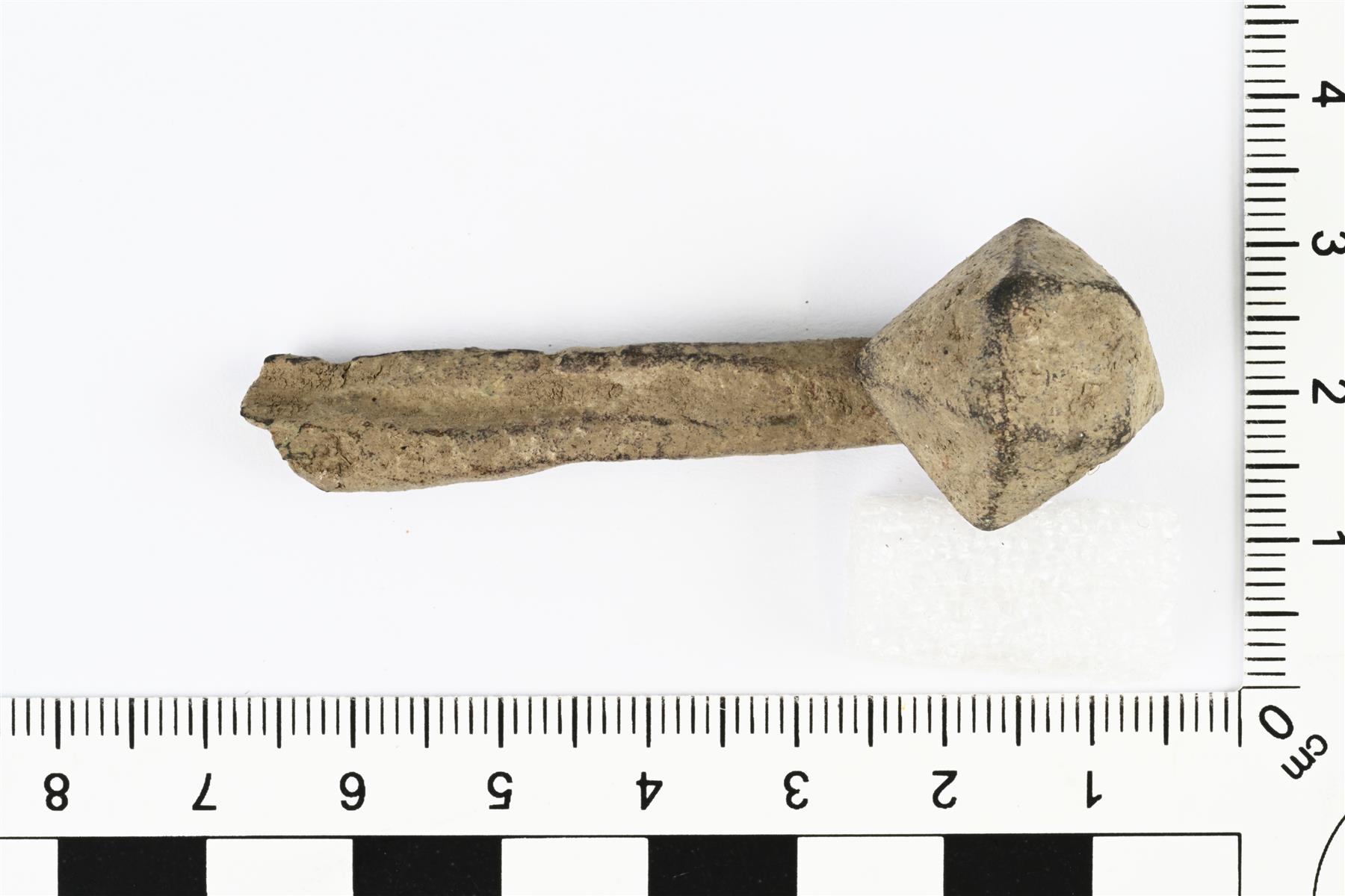 | Hevosenkenkäsoljen kehän ja nupin katkelma. Nuppi on muodoltaan neliömäinen ja sen yläkulmat on viistetty. Kehän poikkileikkaus on kulmista pyöristynyt suorakaide. Vrt. Salmo Abb. 13. | |