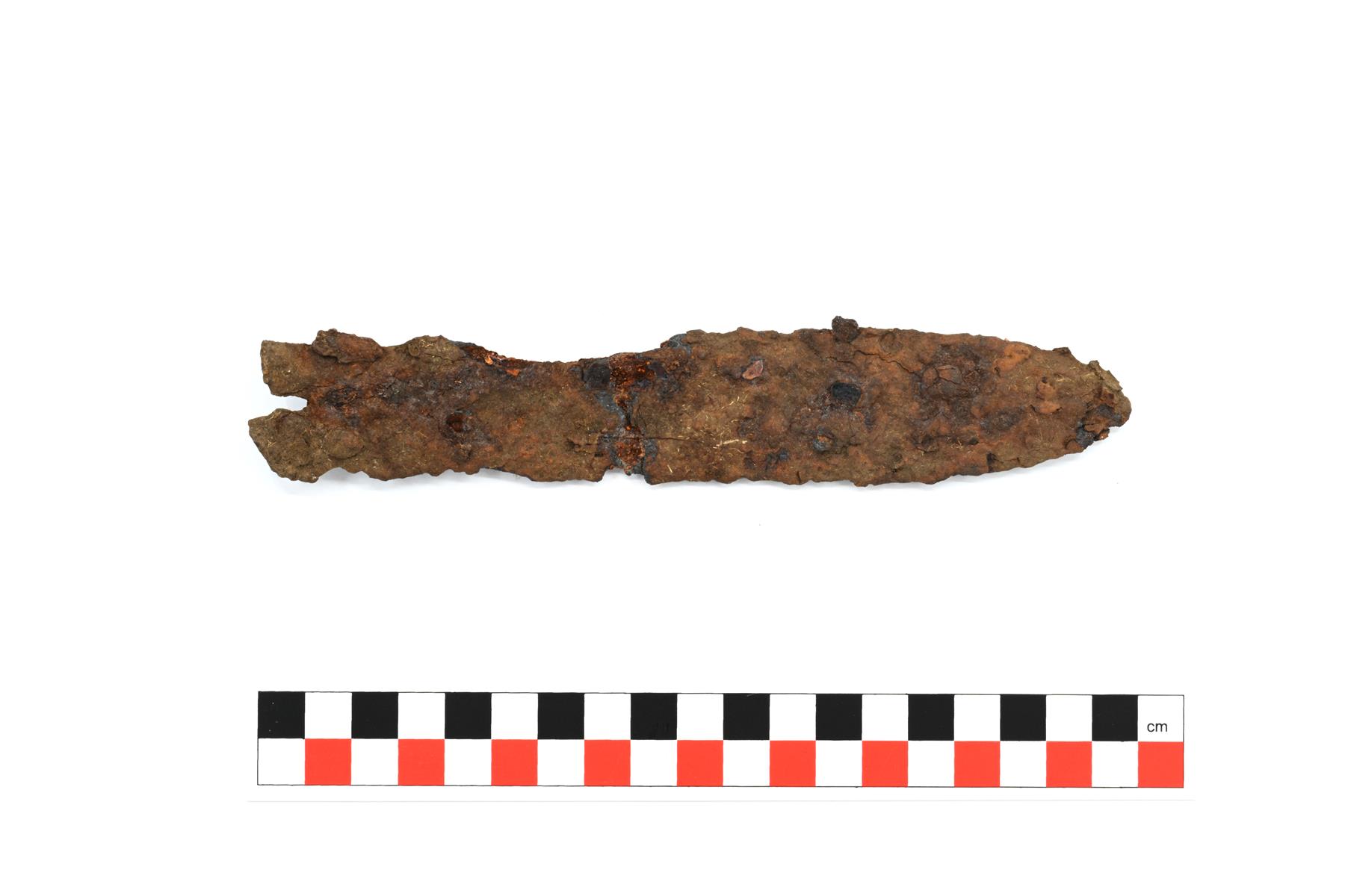 | Kaksiteräisen miekan säilän kärkikatkelma. Säilä on melko kapea. Siinä erottuu molemmilla puolilla matala ja melko leveä veriura. Alaosa on taivutettu ja katkaistu. | |