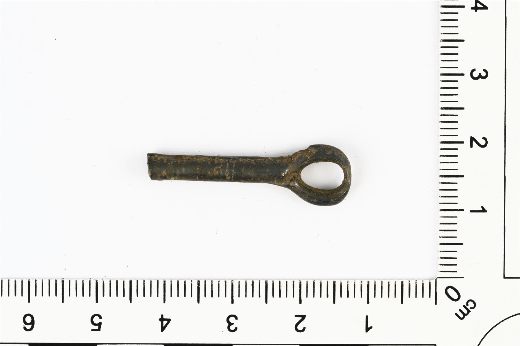 | Kankiketjun nivelen katkelma. Toinen pää puuttuu. Ehjän pään kärki on melko kulunut. Sivuilla on valinsauman jäänne. Koristelusta erottuu poikittaisia viivauurteita. | |