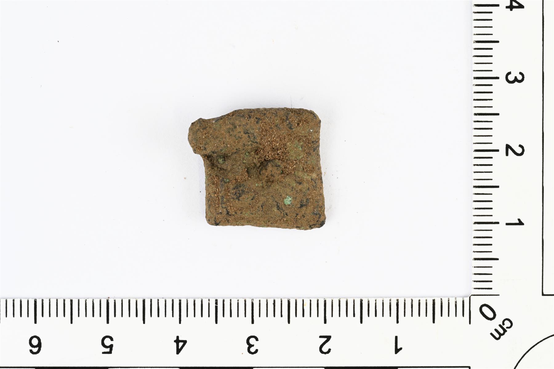 | Neliönmuotoinen vyönhela. Osittain sulanut. Koristeluna erottuu kohokuvioinen vinoristi. Keskellä on reikä ja kiinnitysniitin jäänne. Vrt. Kivikoski Abb. 918 ja 1202. | |