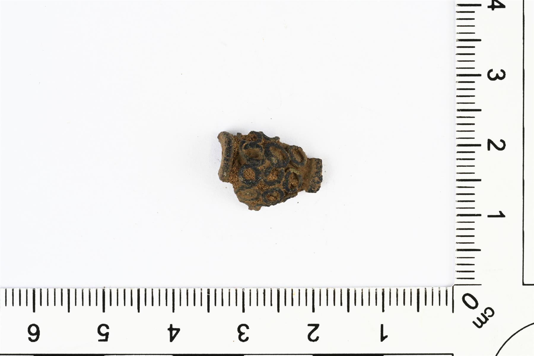 | Kupariseoshelmen katkelma. Ulkopinnassa on kohokuvioisten ympyröiden muodostama koristekenttä. Vrt. Kivikoski Abb. 1160. | |