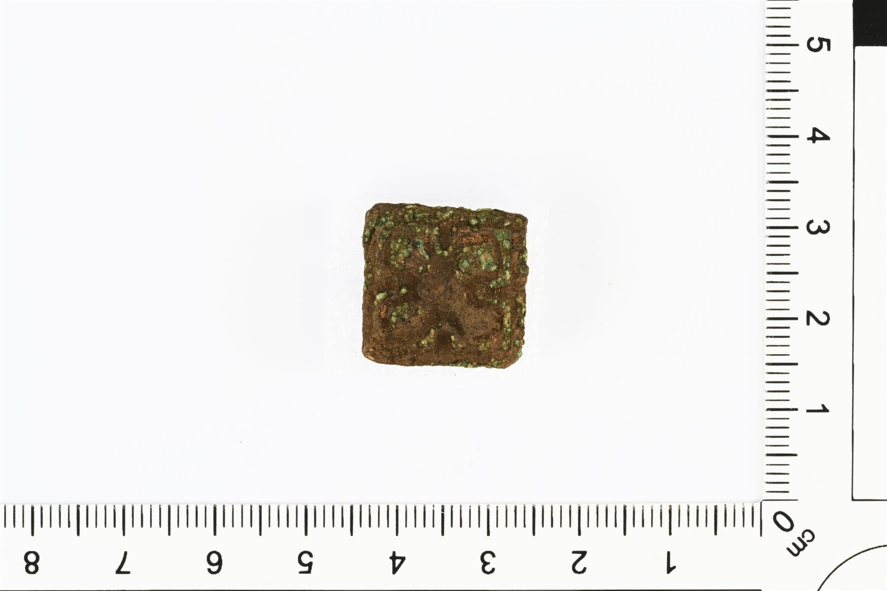 | Neliönmuotoinen vyönhela. Koristeluna on keskellä oleva kohokuvioinen vinoristi. Keskellä on reikä, jossa on säilyneenä kiinnitysniitti. Taustapuoli on koverrettu. Vrt. Kivikoski Abb. 918 ja 1202. | |