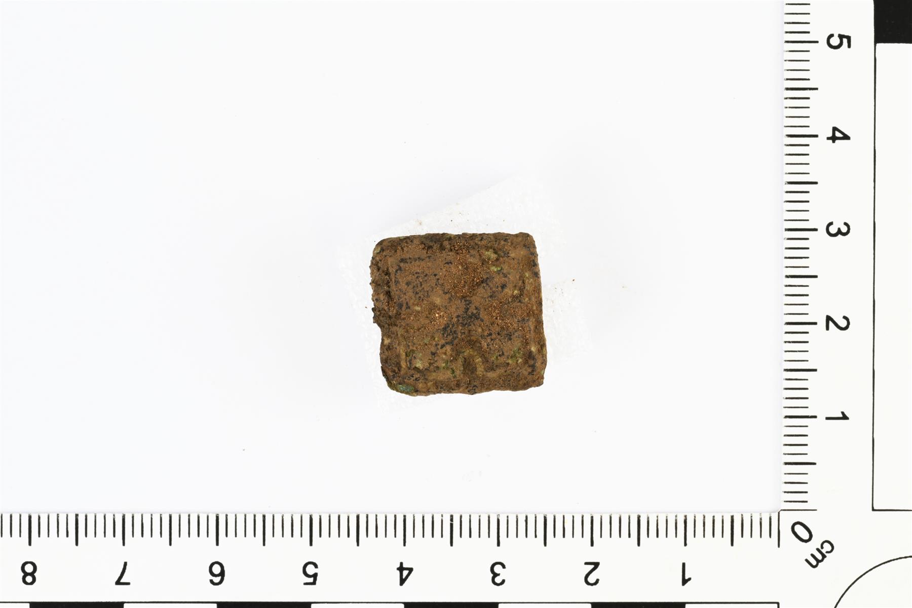 | Neliönmuotoinen vyönhela. Keskellä on koristeena kohokuvioinen vinoristi. Taustapuolella on vääntynyt kiinnitysniitti. Taustapuoli on koverrettu. Vrt. Kivikoski Abb. 918 ja 1202. | |