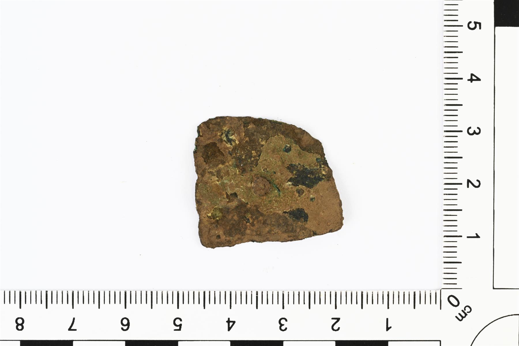 | Ohuesta kupariseospellistä tehty neliömäinen hela. Koristeltu taustapuolelta pakotetuilla pistekuviolla, jotka muodostavat vinoneliön. Keskellä on reikä ja niitin jäänne. | |