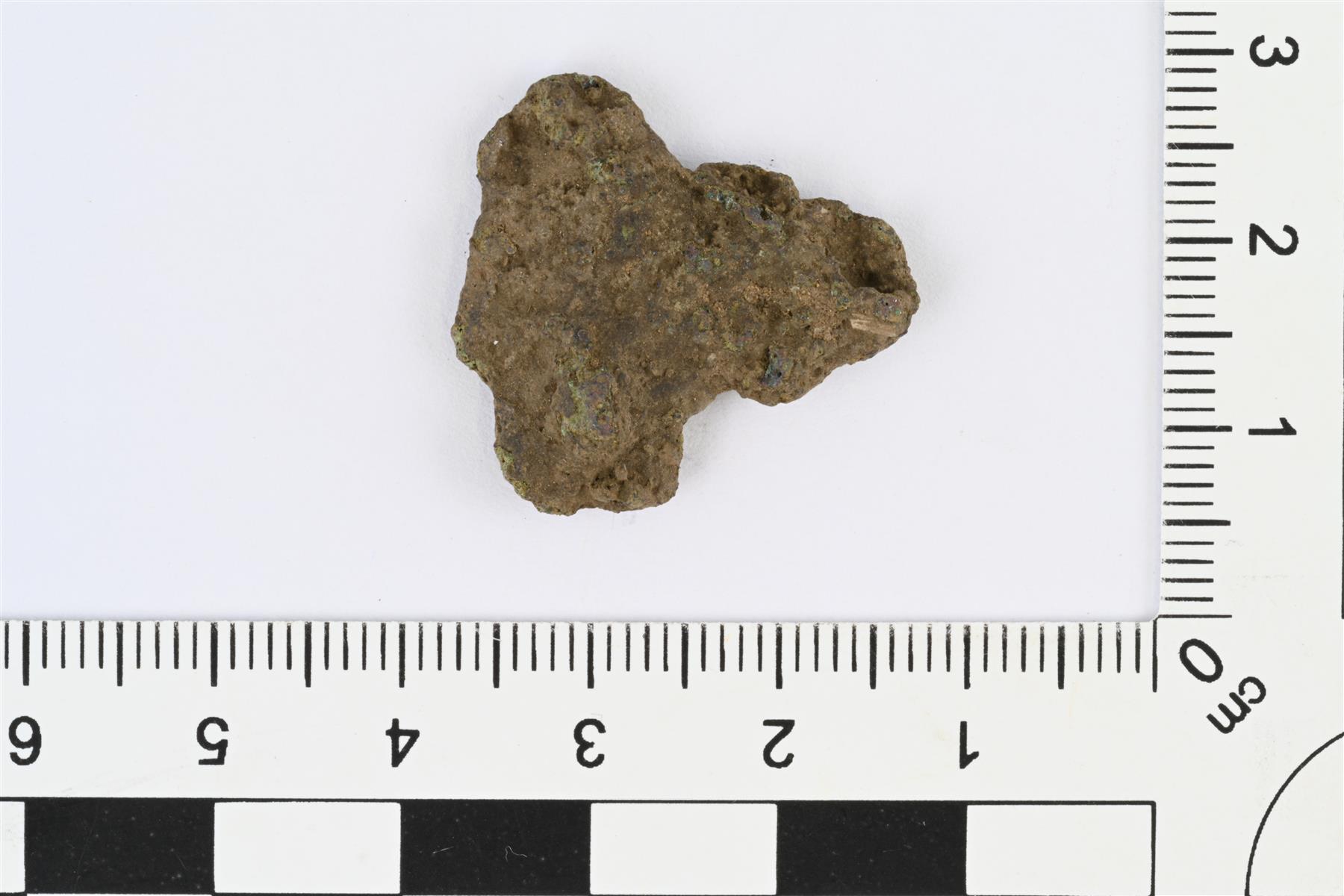 | Mahdollinen tasavartisen soljen päätykatkelma. Osittain sulanut ja deformoitunut. Voi olla myös muun esineen sulanut katkelma tai pelkkää sulanutta kupariseosta. | |