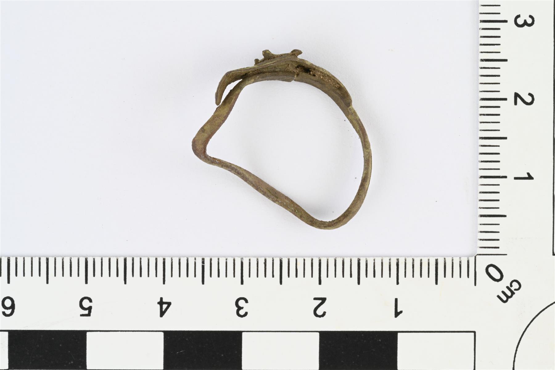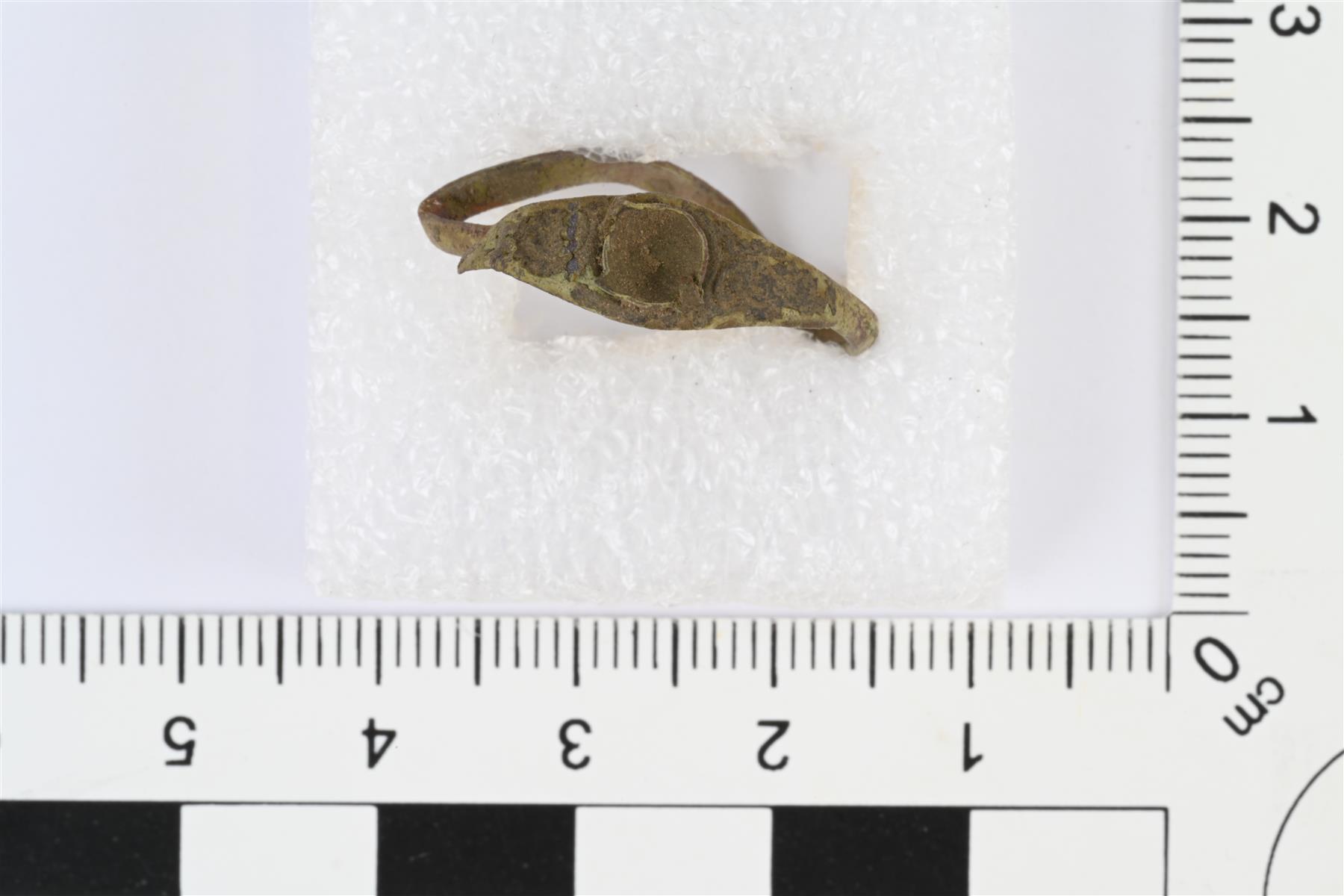 | Vääntynyt sormus. Kapea kehä, jonka päälle liitetty kapea pitkänomainen kanta. Kannassa pyöreä kuoppa, jossa mahdollisesti ollut kivi- tai lasi-upotus. | |