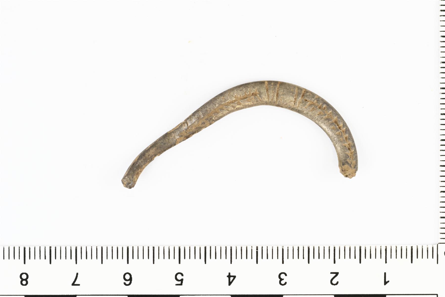 | Hevosenkenkäsoljen kehän katkelma. Koristeltu viivauurrekuvioinnilla. Poikkileikkaukseltaan litteä ovaali. Kapenee päätyjä kohti. Nupit ja neula puuttuvat. | |
