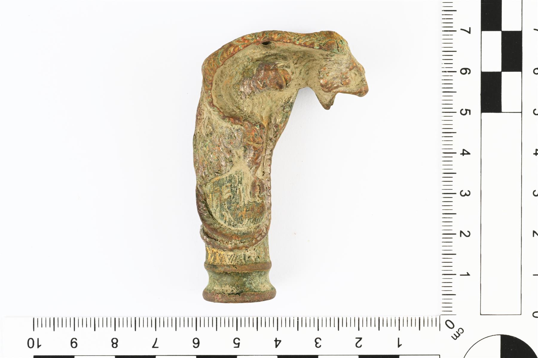 | Groteski-aiheinen nuppi, mahdollisesti kävelykepin pää. Sisäpuolelta ontto ja alaosasta avoin. | |