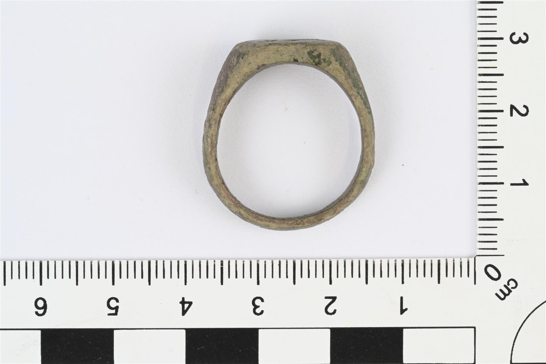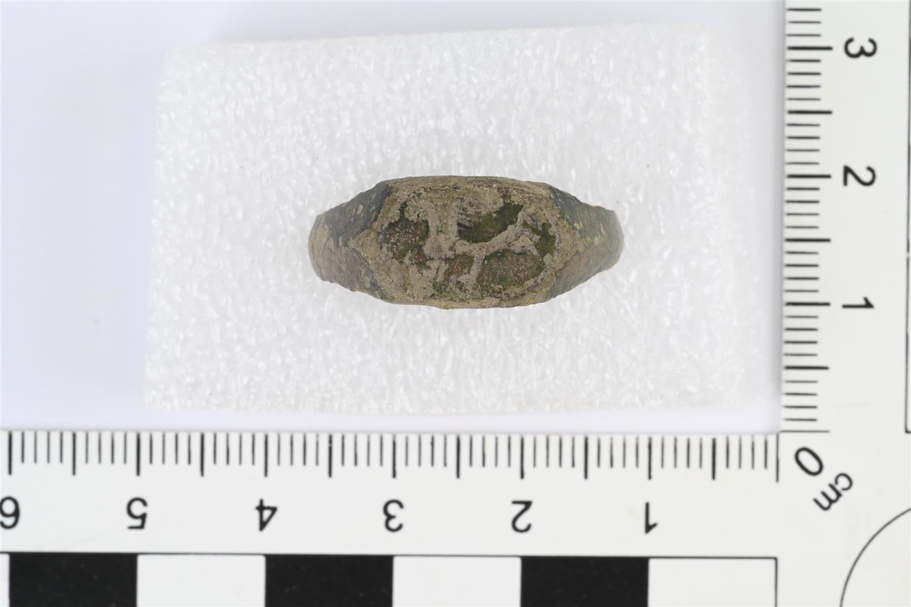 | Sormuksen kehä levenee ja paksunee kapeaksi venytetyn kuusikulmion muotoiseksi kannaksi. Kehän levenevä osa kannan molemmin puolin harjava. Kantaan kaiverrettu epäselvä kuvio, mahdollisesti lintu tai jokin eläin. | |
