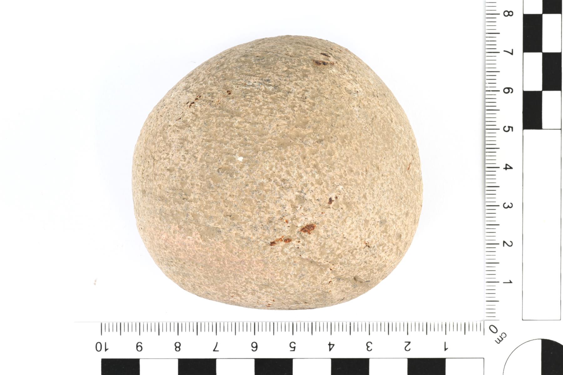 | Pääosin pyöreä jauhinkivi. Yksi sivu on kiventyöstön jäljiltä karkeampi ja kuopalla, mutta muuten kivi on hioutunut melko sileäksi. | |