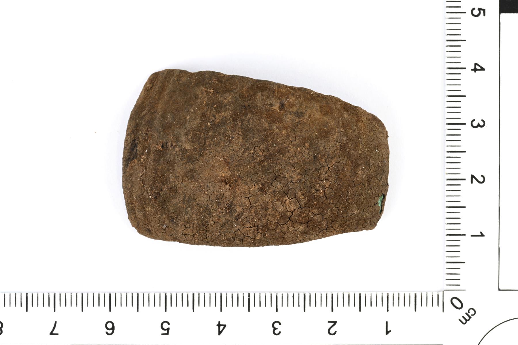 | Massiivisen rannerenkaan päätykatkelma. Levenee päätä kohti. Etupuoli on hieman kupera ja taustapuoli aavistuksen verran kovera. Pinnassa on hauras patinakerros ja sen alta erottuu D:n muotoisten leimojen muodostama kenttä, sekä päädyssä olevia poikittaisia uurteita. Vrt. Kivikoski Abb. 734. | |