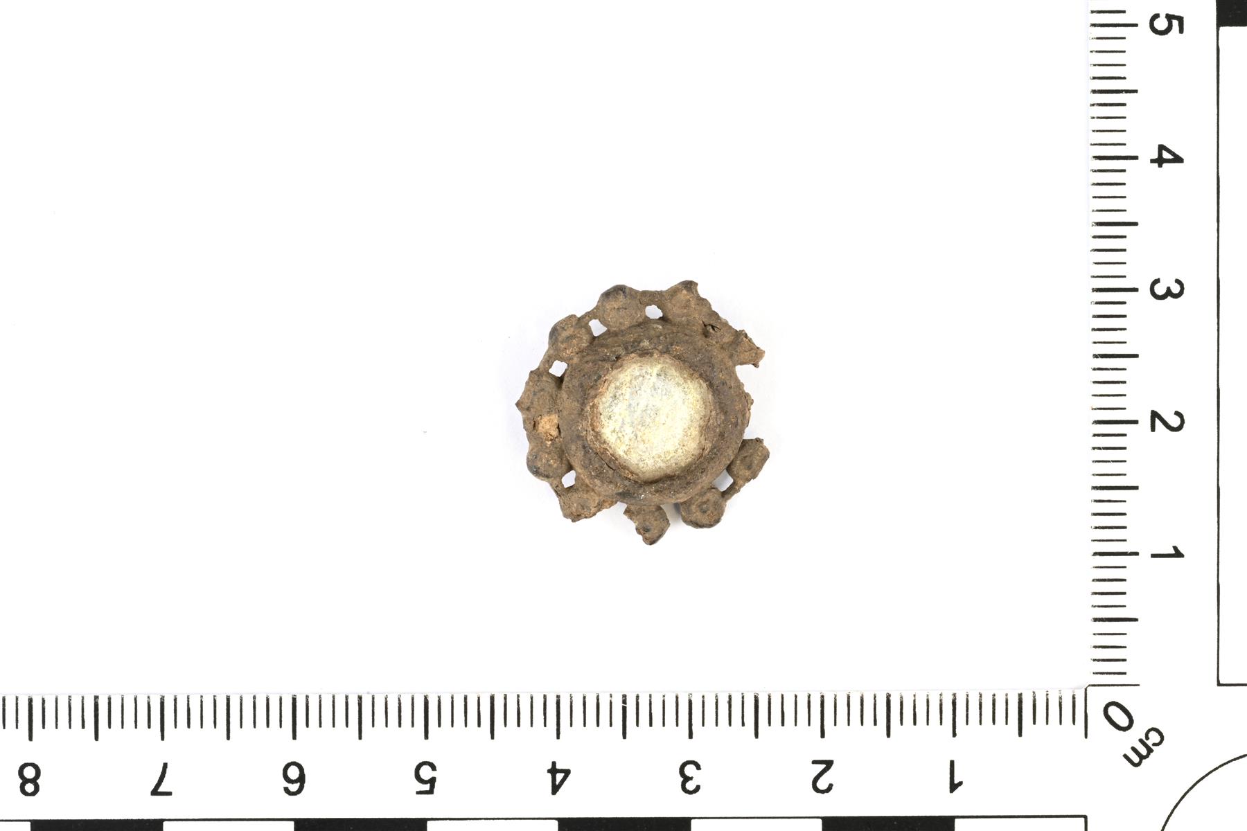 | Pyöreä korunappi tai vaatehakasen osa. Reunat ovat osin murentuneet, mutta säilyneissä osissa on vaatteeseen ompelua varten reikiä. Keskelle on istutettu läpikuultava lasi. | |