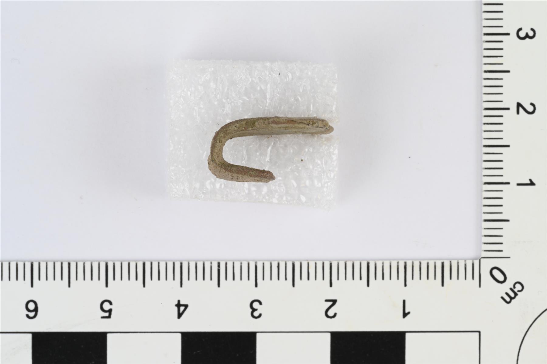 | Hakanen. Toinen pää kaksihaarainen, haarat taipuvat sivuille lenkeiksi. Toinen pää suippeneva ja taivutettu koukuksi. | |