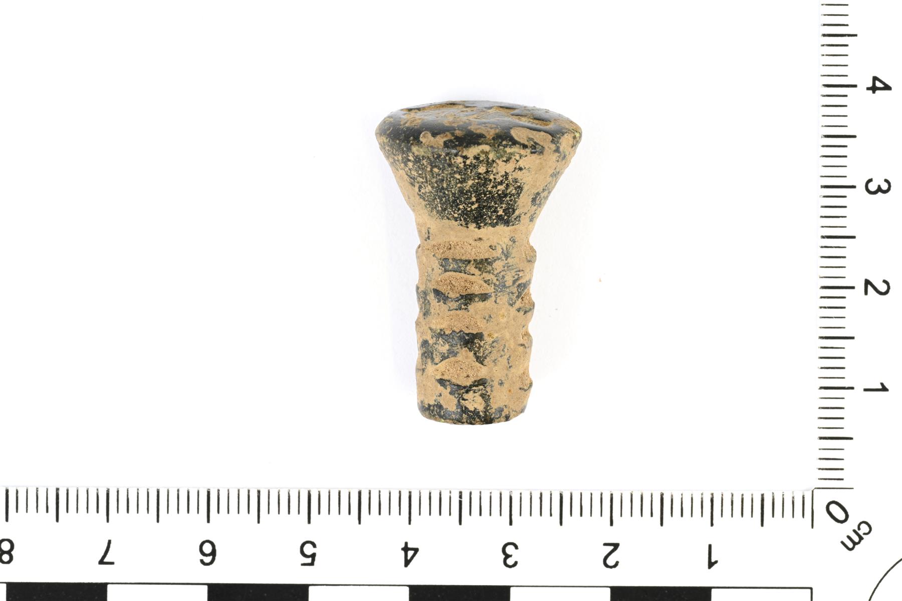 | Nuppimainen sinettileimasin. Päässä on koristeena kruunu ja T-kirjain. Varsi on pyöreä ja uurrettu. | |