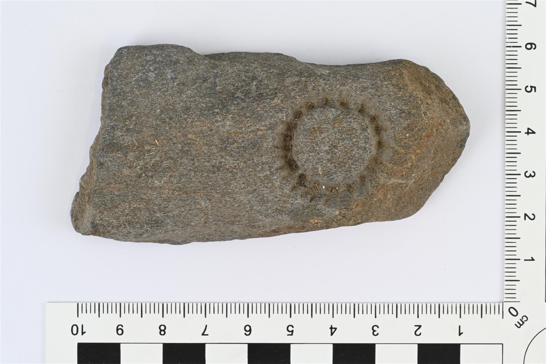 | Liuskeeseen kaiverrettu valumuotti, luultavasti uudelleenkäytetty hioin. Pitkänomainen liuskeenpala, jonka toinen pinta hyvin sileä, luultavasti hioimena käytetty. Toiselle pinnalle kaiverrettu pyöreä kehämäinen valumuotti, jossa uran pohjalla vierekkäin pyöreitä kuoppia ja niistä ulospäin lähteviä säteitä. Mahdollisesti kehäsoljen tai muun rengasmaisen esineen valumuotti. Muotin halkaisija 27 mm. | |