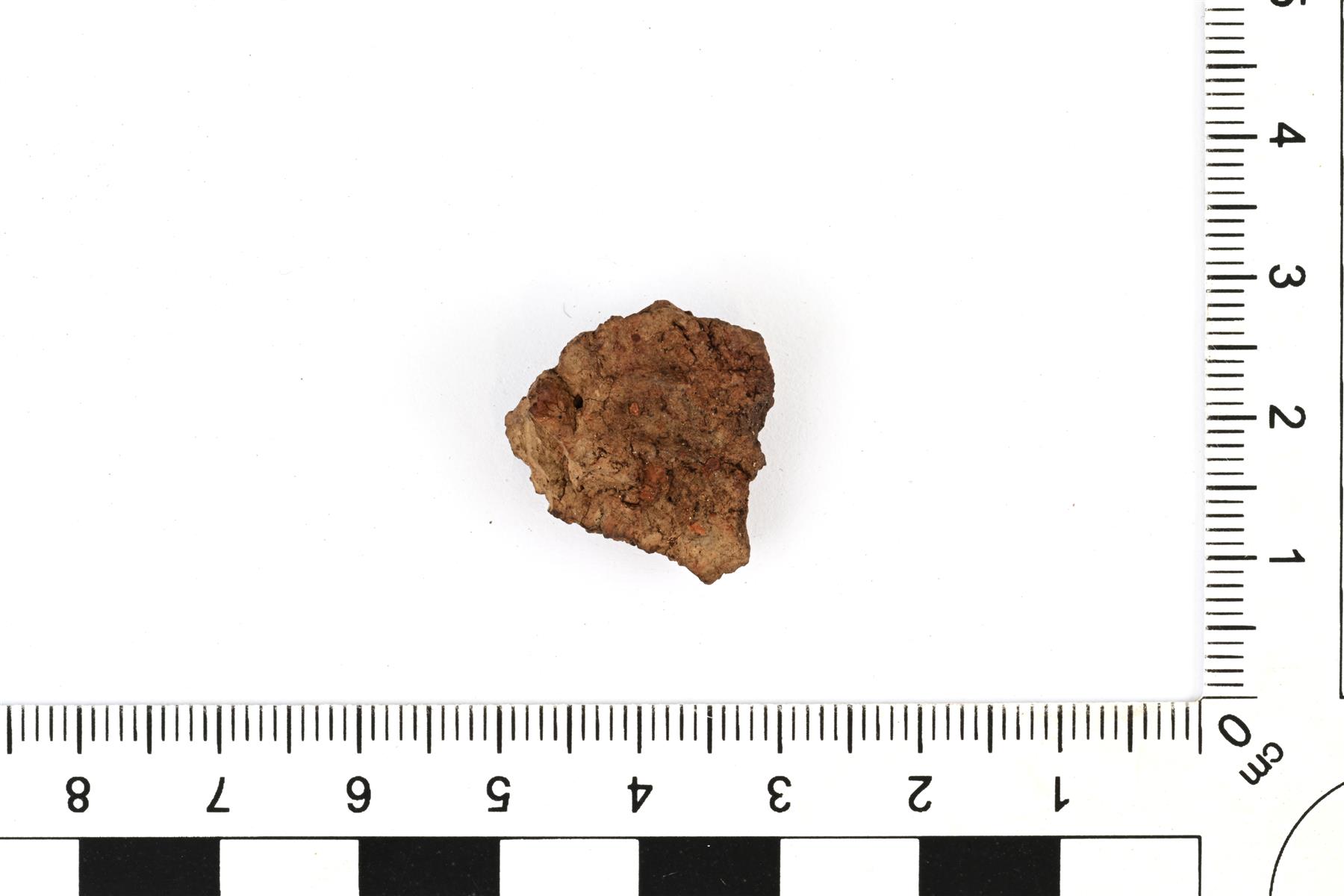 | Karkeasekoitteisen saviastian palanen. Pinnat ovat hajonneet. Sekoitteena kivimurskaa ja samottia. | |