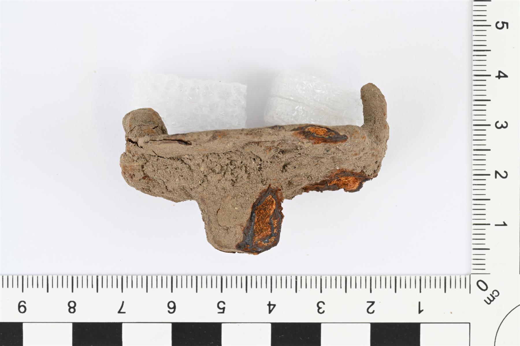 | Kaksipiikkinen hevosen viskari. Pyöristetyn suorakaiteen muotoinen levy, jonka keskellä toisella puolella kohoava ja suippeneva jäänasta. Levyn toisella puolella sen päissä ohuet sisäänpäin taivutetut katkenneet varret. Levyn reunat osittain murtuneet. Vrt. Kivikoski 1973, Abb. 996. | |