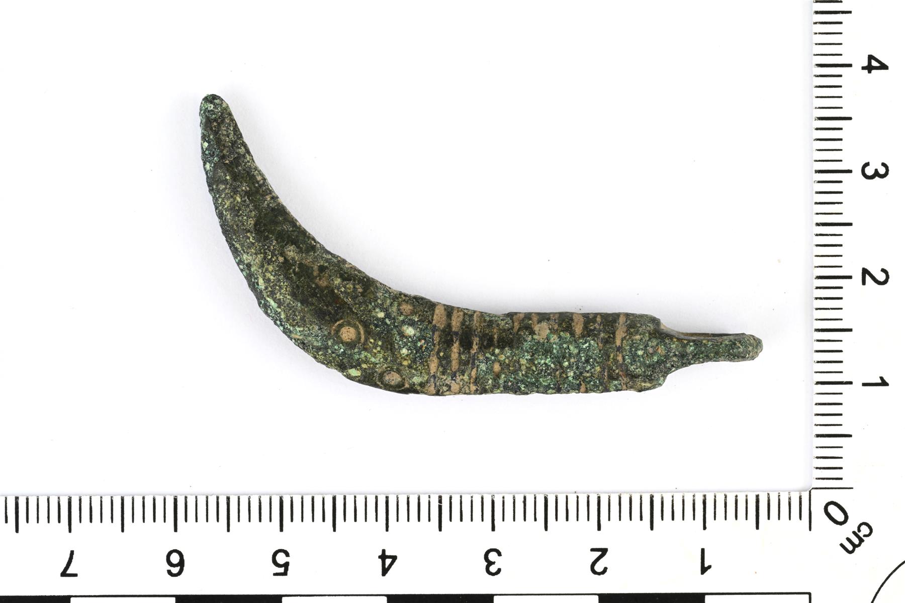 | Kokonaisena säilynyt ja hyväkuntoinen karhunhammasriipus. Yläosassa on koristeena poikittaisia viivauurteita. Keskellä on häränsilmäleimoja. | |
