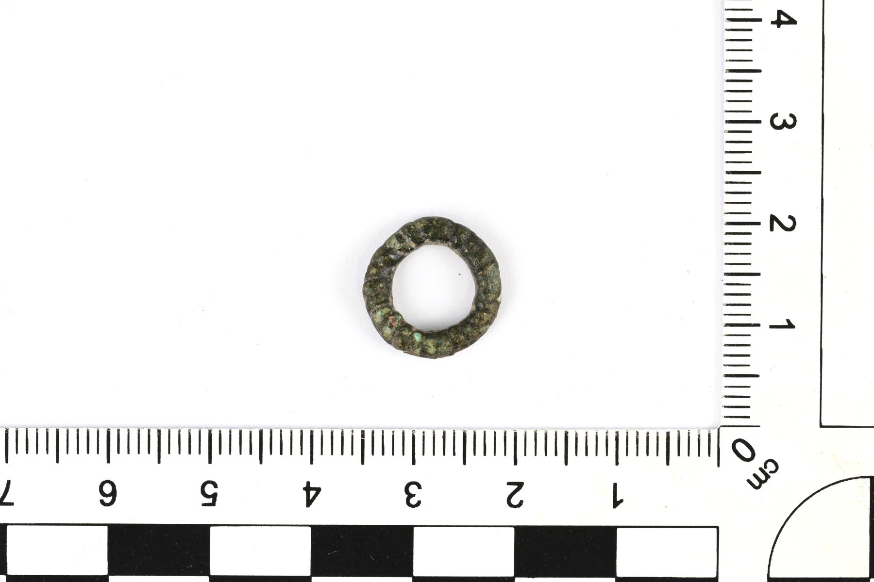| Pyöreä koristerengas. Koristeltu helmikuvioinnilla. Todennäköisesti kaularenkaan tai kääntöjalkasoljen rengaskoriste. Vrt. Kivikoski Abb. 90, 111, 197-198. | |