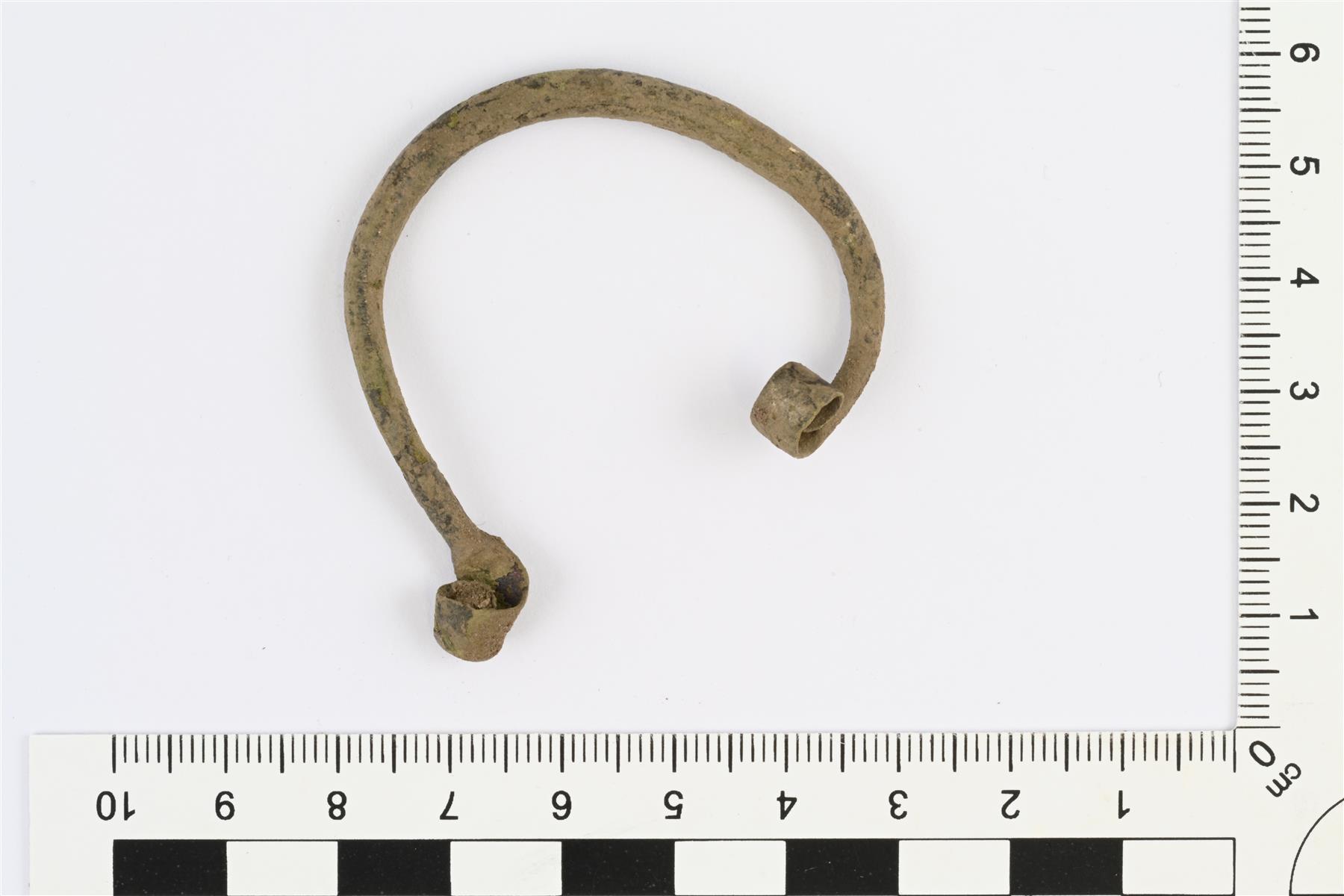 | Rullapäinen hevosenkenkäsolki. Kehä vääntynyt, neula puuttuu. Nupit on tehty kiertämällä levymäiset päädyt rullalle, toisen pään rulla litistynyt. Kehän poikkileikkaus pyöreä. | |
