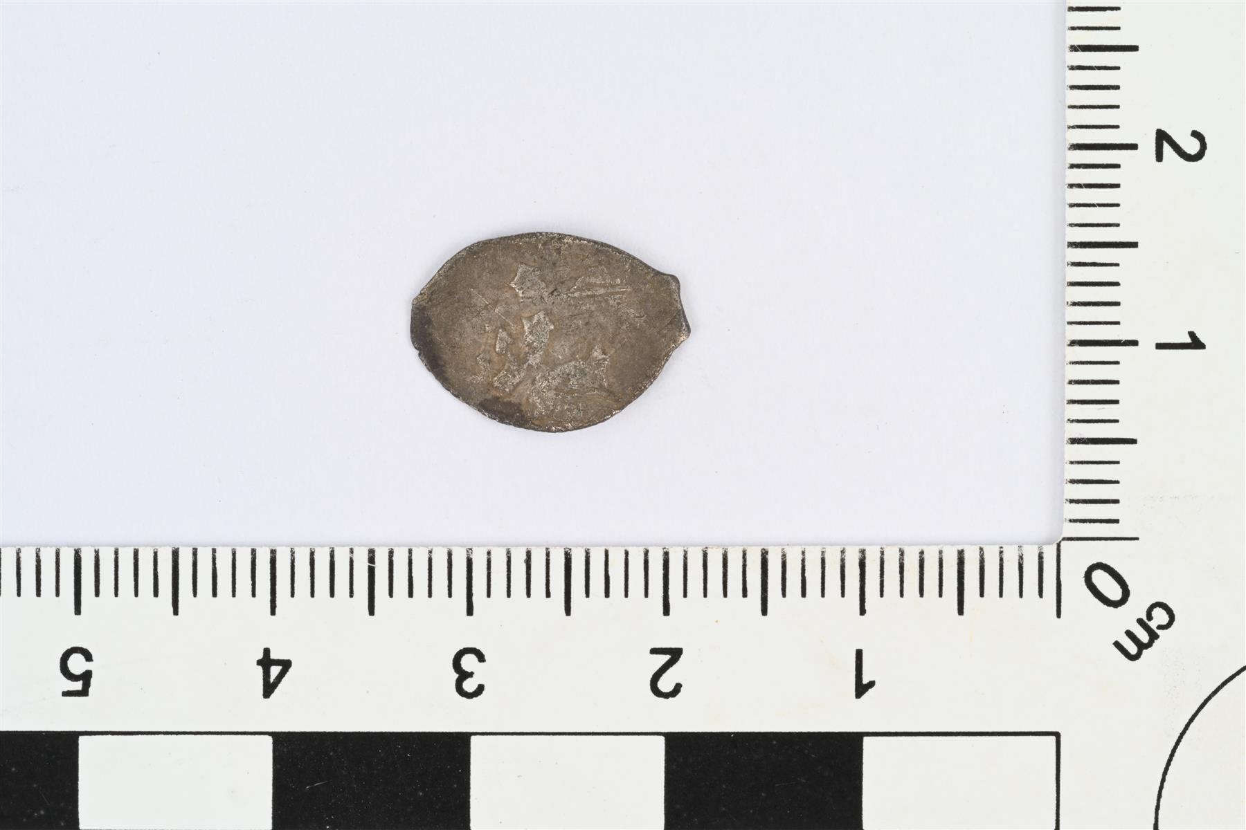 | Tipparaha. Mahdollisesti Mikael Fjodorovits Romanov, kopeekka, 1642. Vääntynyt. | |