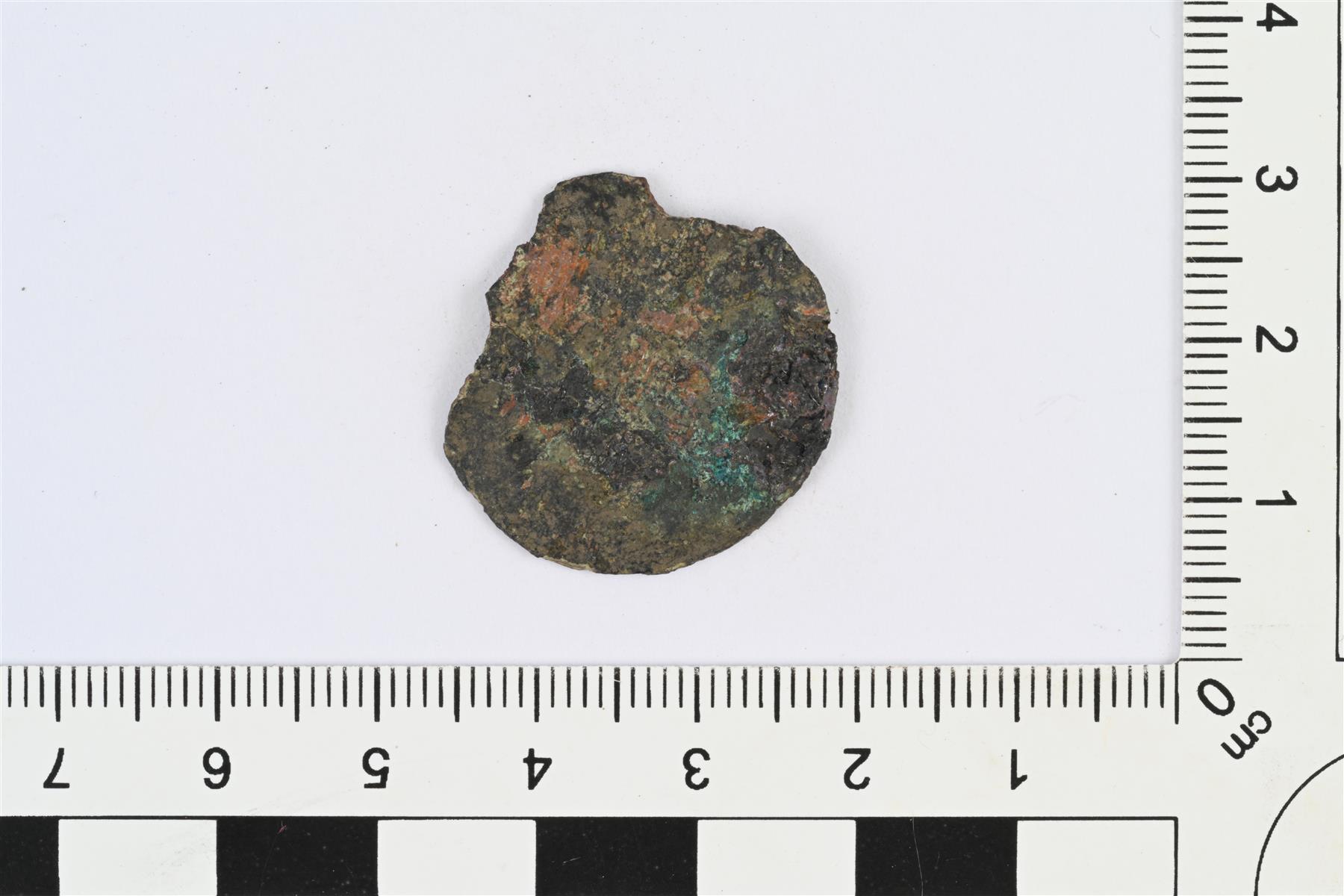 | Huonokuntoinen kupariraha, reunasta murtunut paloja. | |