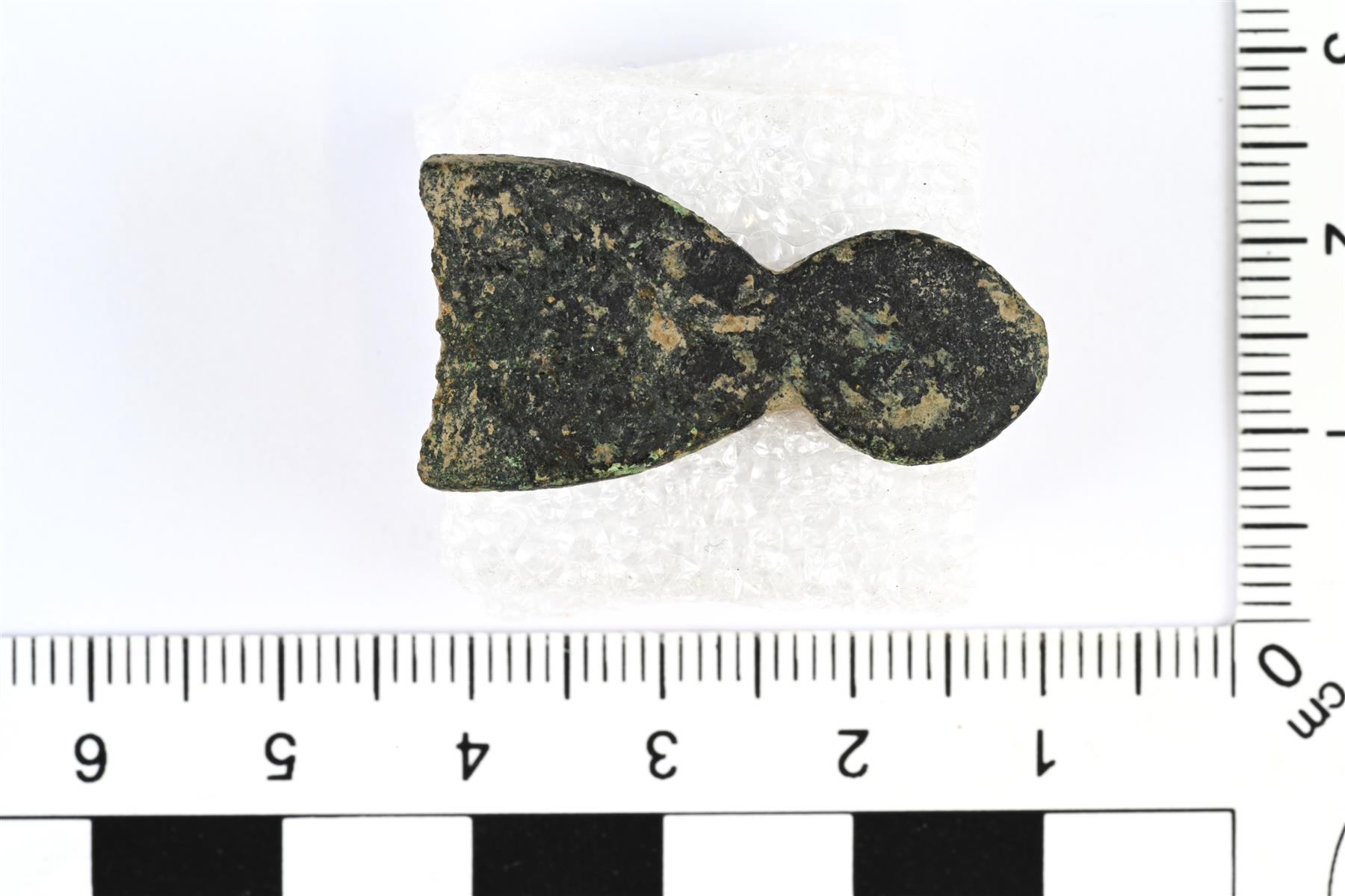| Koristesoljen katkelma. Keskiosan ja päädyn välillä on kavennus. Taustapuolella on jousilaitteen kiinnityslenkki. | |