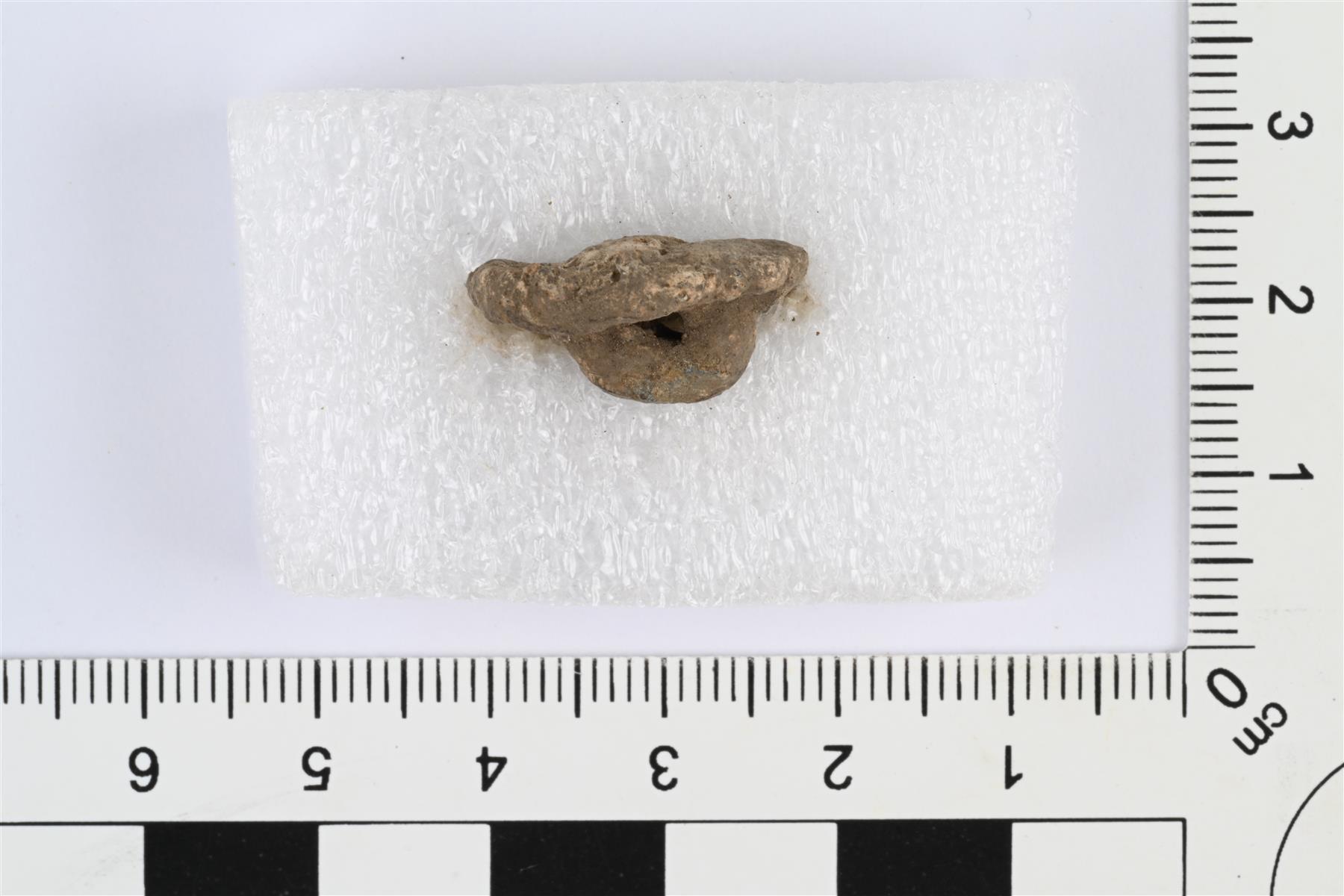 | Paksu litteä nappi, taustapuolella jykevä kanta. Lyijyseosta. Vääntynyt. | |